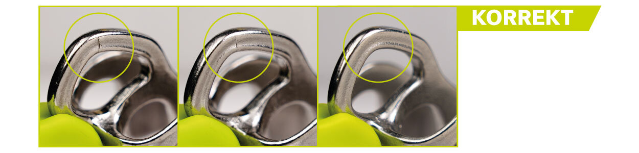 Geräte, die vergleichbare Oberflächenveränderungen aufweisen, dürfen nicht verwendet werden. Stellen Sie nach der Überprüfung Ihres Gerätes einen Defekt fest, wenden Sie sich bitte an unseren Kundenservice per E-Mail: service@edelrid.de. Sie erhalten von uns einen Rücksendeschein, anhand dessen Sie das Gerät kostenfrei zu uns zur Überprüfung einschicken können.