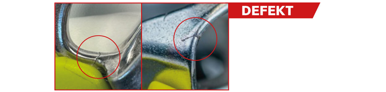 Prüfen Sie die Oberfläche des Metallkörpers, insbesondere die Nachsteigeröse, auf Abweichungen wie Falten, Stufen, Risse o.ä.