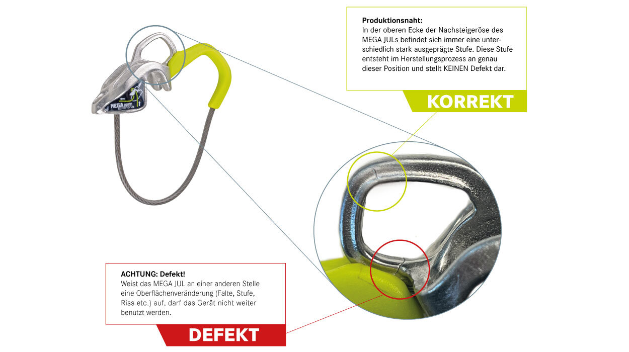 EDELRID ruft Besitzer*innen eines MEGA JUL Sicherungs- und Abseilgeräts der Charge 04/20 auf, das Gerät optisch auf einen möglichen Defekt zu überprüfen.