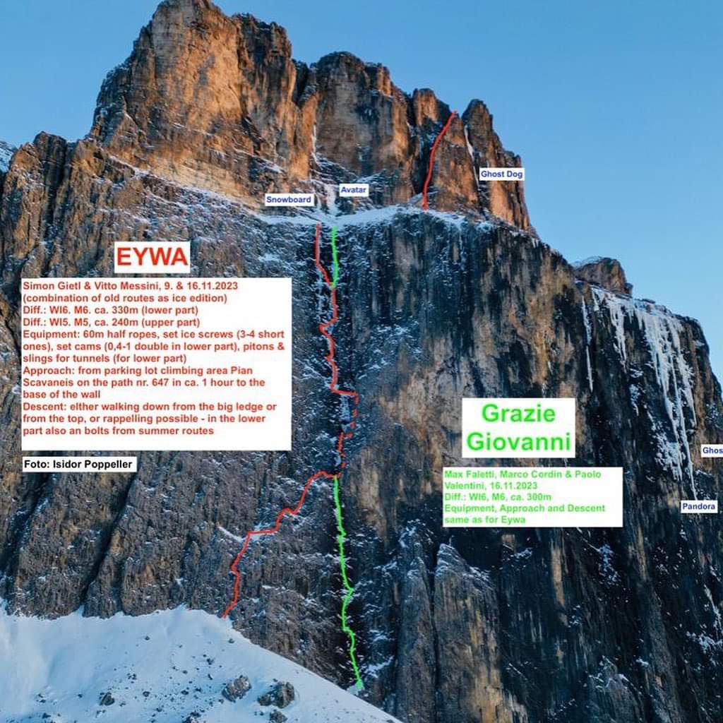 Die beiden Simon Gietl und Vittorio Messini eröffnen mit „Eywa“ eine beeindruckende Mixedline an der Pordoi Westwand. Die 670 Meter (Teil 1 bis zum großen Band 330 Meter,WI6, M6; Teil 2 WI5, M6 240 Meter). Die Route ist im Grunde genommen, keine reine Erstbegehung, sondern eine aus der Kombination verschiedener alter Felsrouten entstandene Mixedroute.