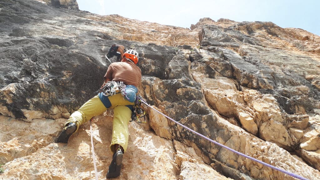 Naja, dafür wären wir ja nicht hier. Und weil das Wetter und vor allem die Temperaturen für mich stimmten liefen wir am nächsten Morgen zur Punta di Soel. Da konnte ich gleich nochmal die Schwierigkeiten der ersten 4 SL prüfen. Sabine hatte schon etwas mit den Schwierigkeiten zu kämpfen und griff so ein paar Mal zur Steigklemme. Auch für sie eine neue Erfahrung. Auf dem großen Band angekommen, gibt’s ne kurze Pause und ich Versuche es gleich mit Expressschlingen einhängen. Da ging mir in der 2. Crux leider die Puste aus, so das ich die Schlingen noch hoch hänge und es mir in der Sonne gemütlich mache. Nach einem kurzen Powernap steige ich ohne weiteren Ballast ein und ziehe die letzten 3 weiten Züge der 2. Crux bis zur rettenden Kelle durch. Jetzt heißts die Schnappatmung abstellen und die letzten Meter wie einstudiert hochspulen und den Stand klippen. Somit wäre diese SL auch abgehakt:-).