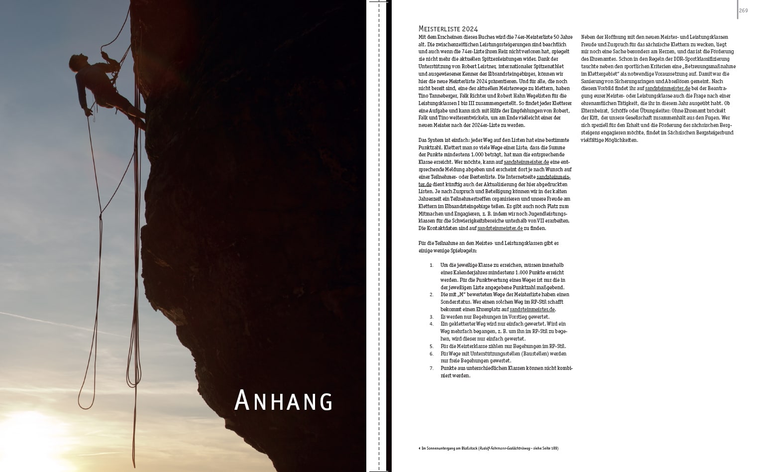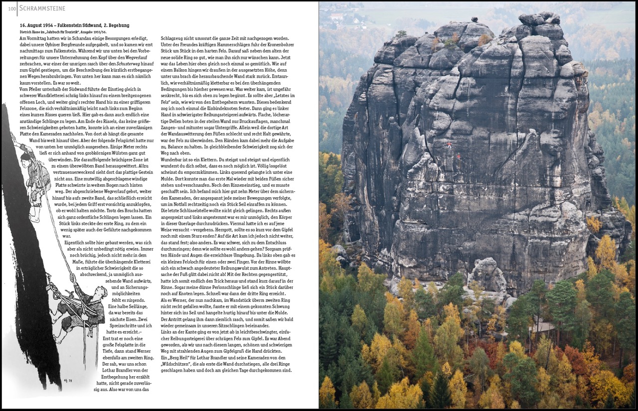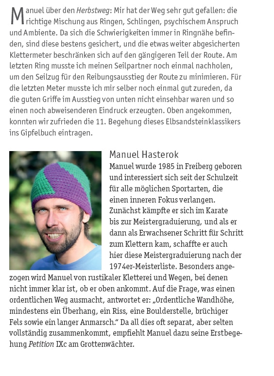 So erlebte die Meisterwegliste von 1974 ein Comeback und das zu Recht: sind doch einige der großartigsten Linien im Elbsandsteingebirge (+4 im Zittauer Gebirge) unter ihnen. Zwar sind die rein numerischen Grade schon lange nicht mehr das Maximum, aber bei Schwierigkeiten zwischen VIIIa und IXc und einer oft herausfordernden Sicherungssituation verlangen diese Wege auch heute noch den souveränen Vorsteiger. Zwölf der Meisterwege musste man damals in einem Jahr klettern, um Meister des Sports zu werden.