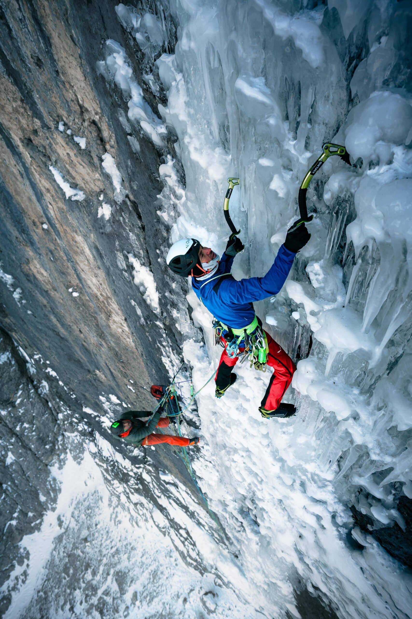 Der Anfang lief vielversprechend: Schöne, positive Löcher und Leisten ermöglichten ein zügiges Vorankommen. Doch kaum hatten sie den markanten Beginn der Eisspur erreicht, passierte das Missgeschick: Sie stellten fest, dass sie ihre Eisschrauben vergessen hatten. Das eingespielte Team konnte sich nur noch darüber amüsieren. Kein Problem, dachten sie sich: Der Plan für diesen Tag war dahin, aber die Fertigstellung der Linie würde eben auf einen anderen Tag verschoben.