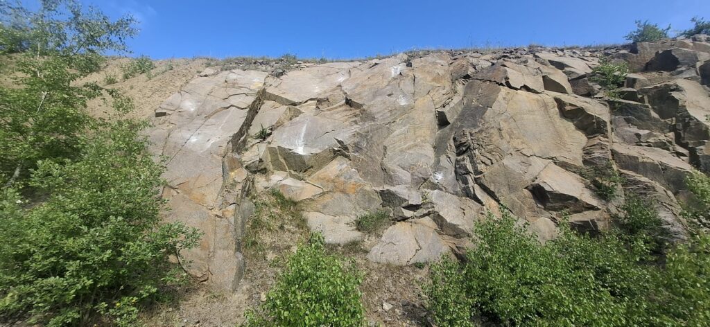 Almeløkkebruddet is located near the latter quarry. Until 2023, only six sport climbing routes graded 4b to 6c in the ‘Gryden’ sector had been developed in the quarry, despite its great potential. This should change in 2023. Since then, there have been nine new routes in two new sectors. Above the road n the road to ‘Vangbruddet’ the sector “Manege” with 4 routes and below the road the sector ‘Arena’ with 5 new routes.