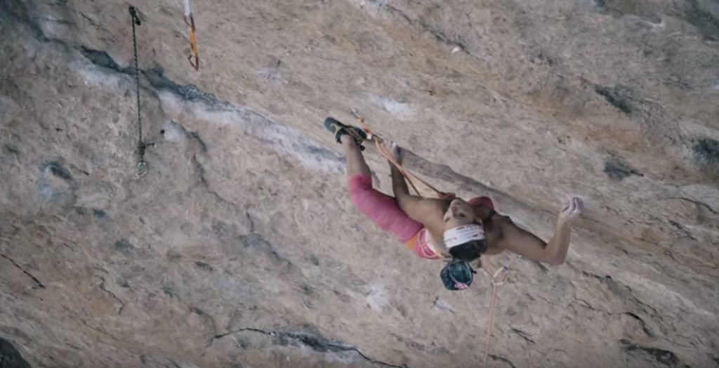 Um die 25-jährige Amerikanerin Sasha DiGiulian ist es ja in letzter Zeit etwas ruhig geworden, nun gibt es wieder ein Video von ihr in „American Hustle“ (8c) in Oliana. Die etwa 50 Meter lange Route wurde im Jahr 2014 von Sam Elias erstbegangen: