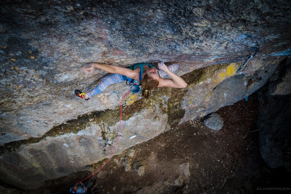 Die Route „Odd Fellows“ scheint bei Frauen sehr beliebt zu sein. Nach Sarah Seeger im Jahr 2016, holte sich auch Alex Schweikart 2010 eine Wiederholung. Sarah beschreibt die Route wie folgt: Der untere Teil besteht aus kräftigen Zügen an Löchern und Leisten, auf die ein mäßig-guter Schüttelpunkt folgt. Im oberen Teil neigt sich die Wand zurück, trotzdem ist an den recht kleinen Seitgriffen und Leisten volle Körperspannung gefragt. Die Durchstiegs-Crux für mich war ein Zug von einem schlechten Schultergriff auf eine scharfe Leiste kurz vor der Umlenkung.