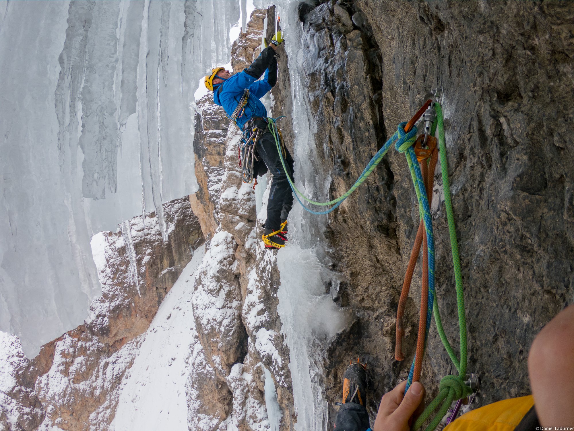 Alle Stände und Zwischensicherungen sind mit Bohrhaken ausgestattet. So das nur ein paar Expressschlingen und Eisschraben notwendig sind.