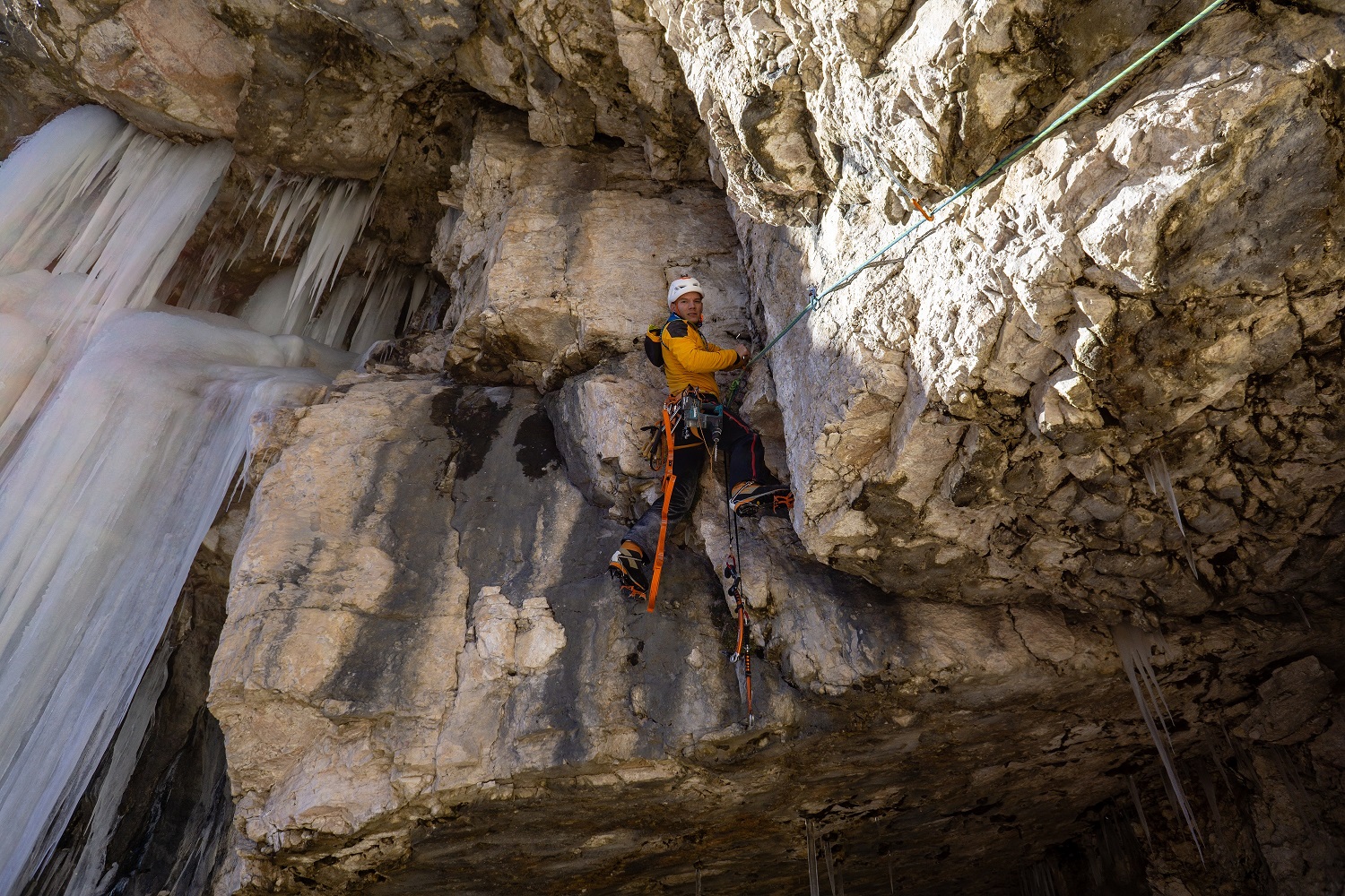 Daniel dazu: „Nachdem wir vor einer Woche unsere Erstbegehung „Teufelsgeige“ kletterten viel uns sofort auf der Südseite links vom Mystera die riesige Grotte mit den mächtigen Eiszapfen auf. Wir waren uns sofort einig die Route, sobalt wir das nächste mal zusammen Zeit hätten, anzuschauhen. So Stiegen wir am Dienstag die breite Rinne mit schweren Rucksäcken bepackt die Rinne zum Einstieg auf. Von dort kletterten wir abwechselnd eine supertolle Linie bis auf die rießige Stevia Hochfläche!!“