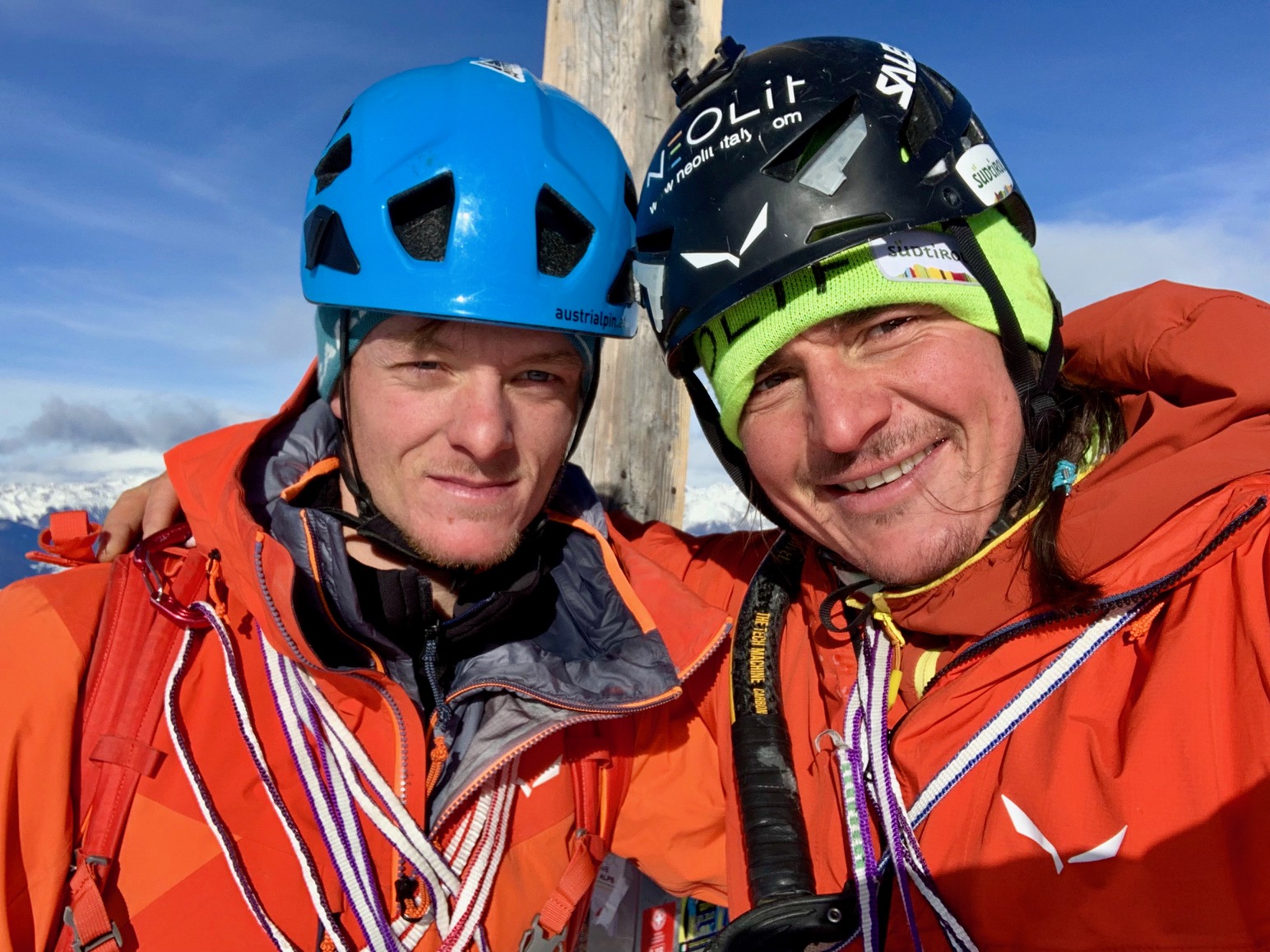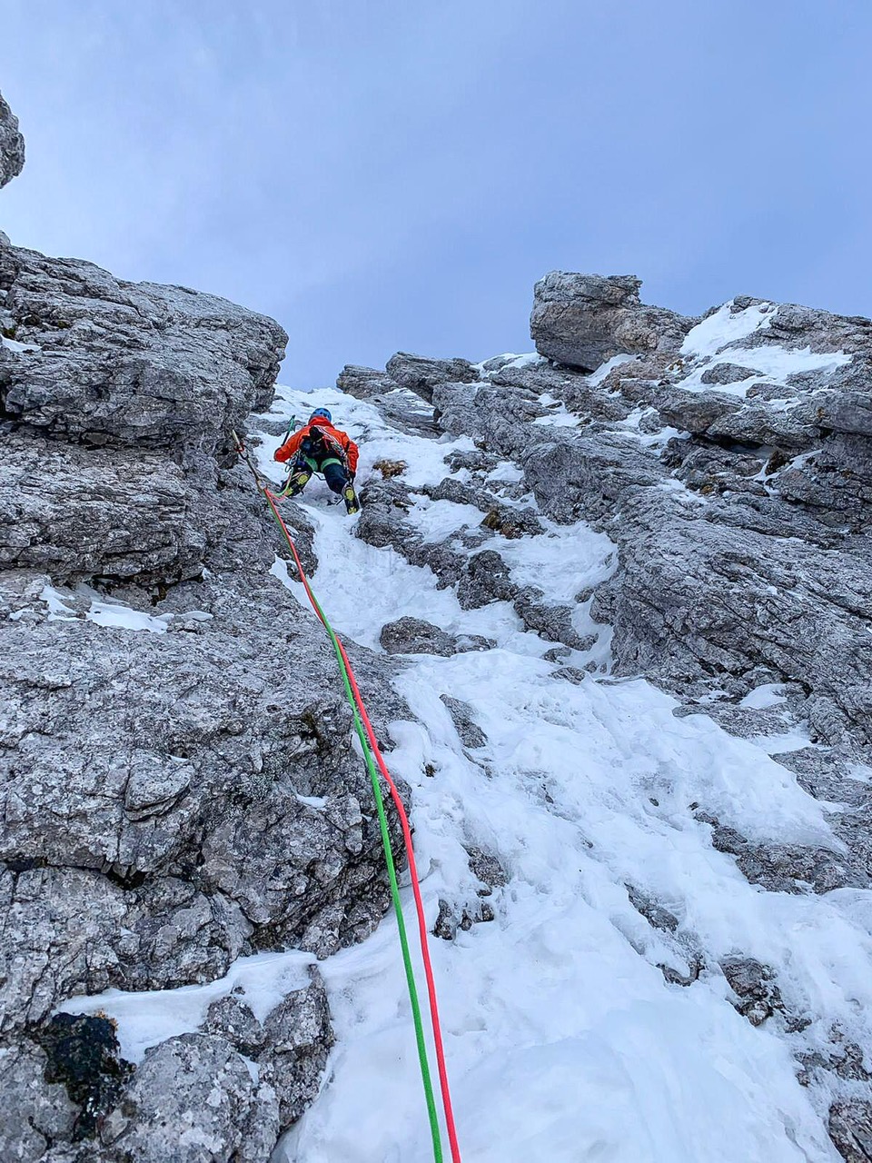 Mit Mark Oberlechner konnte ich einen ebenfalls sehr motivierten Partner finden. Einige Tage Tage vorher wollte ich mir nochmals die Situation am Peitlerkofel genauer anschauen. Dabei war Davide Prandini mein Seilpartner. Wir spurten die ersten sechs Seillängen. Auch er war ebenso begeistert von der geplanten Linie. Unser Augenmerk galt der Schneesituation und der möglichen Linienführung auf der Eisspur. Darüber hinaus kreisten meine Gedanken ständig um eine mögliche Eintages Begehung. Am 26. Januar um 6.30 Uhr stiegen Mark Oberlechner und ich dann voller Motivation und Konzentration ein. Dabei lag der Fokus bereits auf eine rasche Nonstop Eintages Begehung der Route. Material und Ausrüstung waren daruf abgestimmt. In den ersten Seillängen machte uns ein stürmischer kalter Nordwind das Klettern schwer. Die ohnehin schon tiefen Temperaturen fühlten sich so noch um einiges frostiger an. Bis zum Einststieg der markanten Eisspur kletterten wir alles simultan. Die Eisspur war schließlich ebenso heikel wie schwierig. Die Schlüsselseillänge enpuppte sich als sehr ernstahftes Unternehmen. Eine verlässliche Absicherung war kaum möglich. Mit voller Konzentration und größter Vorsicht gelang es uns diese Länge, in der Stürzen strengstens verboten ist, zu meistern. Nachdem die Eislinie ihre Steilheit spürbar verliert, wird das Klettern wieder entspannter und auch technisch einfacher. Charakteristisch waren die vielen gefrorenen Schneepolster und die sehr dünne Eisauflage. Wir waren mehr als glücklich, die Schlüssellänge gemeistert zu haben. Neben der sehr heiklen Art der Kletterei machten unds noch unzählige Spindrifts das Leben schwer. Mit dem geneigtem Gelände nahm auch die Möglichkeit zuverlässige Standplätze einzurichten wieder zu. Dennoch war das Anbringen von Zwischensicherungen sehr schwierig. Nach ca. 200 Meter war die Eisspur zu Ende. Nachher zeigten uns ein logischer Kanal und ein Schnnegrat die Linie zum Gipfel. Bis dorthin waren noch einige sehr anstrengende Höhenmeter im lockeren Tiefschnee zu absolvieren. Um 11.50 Uhr konnten wir uns überglücklich die Hände reichen und uns ein herzliches Bergheil wünschen. Ein ganz besonderes Gefühl machte sich breit. Dennoch galt es noch vorsichtig den Abstieg entlang des Normalweges zu bewältigen. Die angespannte Schneesituation ließ uns nochmals vollste Konzentration walten zu lassen.