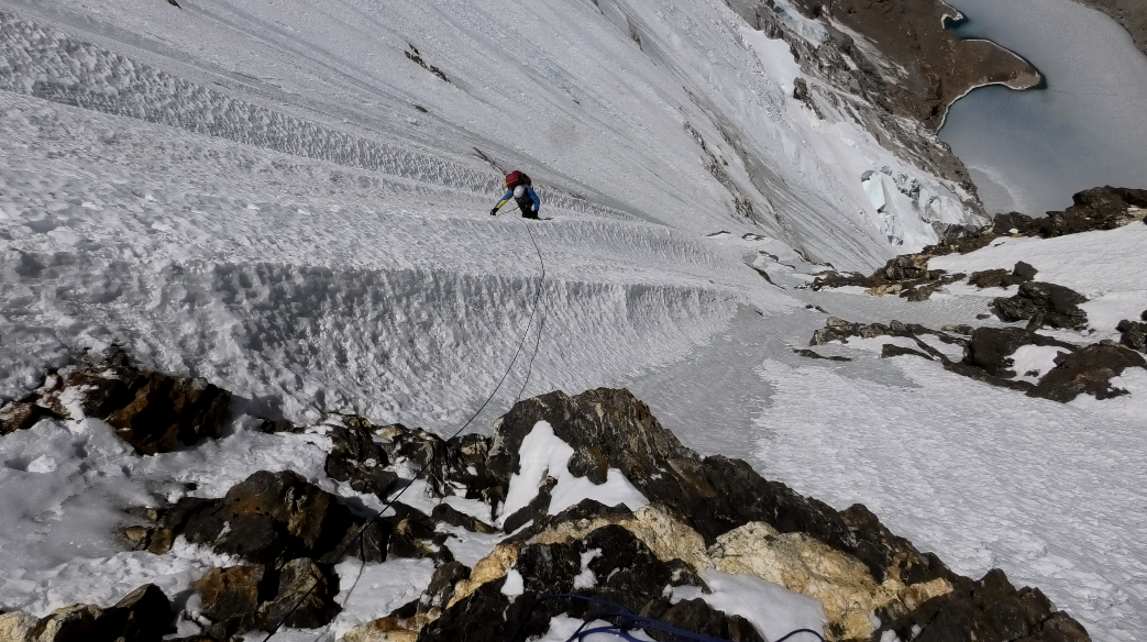 Am Morgen fiel die Entscheidung, weiter zu geben, so fingen wir an, uns durch die Schneeorgel, die vom weiten an einen Plisseerock erinnerte, durchzuhauen. Stellenweise trafen wir an angenehmen Firn, ein anderes Mal wieder an Eis hart wie Beton. Es erinnerte an eine Sisyphusarbeit, wo sämtliches Bemühen seine Wirkung verfehlte. Der Durchstieg war schließlich technisch nicht so schwer wie physisch. Zehntausende ausgeführte Bewegungen hatten uns in der Summe ganz schön erschöpft. Ungeachtet dessen, dass man die Sicherungsmöglichkeiten während der Längen oder bei der Zweierseilschaft diplomatisch als bescheiden bezeichnen könnte. Der Tag hatte kein Ende und wir konnten stets keinen Platz für das dritte Biwak finden. Der herumfliegende Schnee trieb uns immer mehr an, die unerfreuliche Lage irgendwie zu beenden.