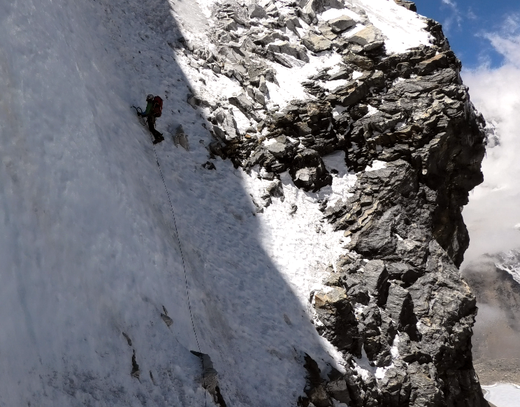 Eilig sausten wir weiter, leider verlangsamten unsere Schritte. Der Grund war nicht die Höhe, sondern das Gelände. Der den Berg in zwei Seiten teilende Grat in Form einer Klinge war wie Dr. Jekyll und Mr. Hyde. Man konnte dort am besten vorrücken, die Nordabhänge bildete jedoch bröckeliges Eis und die Ostseite schlug der Wind zu lockerem Schaum. Dazu kamen Felsschwellen, die nach dem Abseilen verlangten. Die ganze weiße Schlangenlinie sah von oben so aus, als hinge sie in der Luft. Ein unendlicher kilometerlanger Grat ohne eine Sicherungsmöglichkeit.