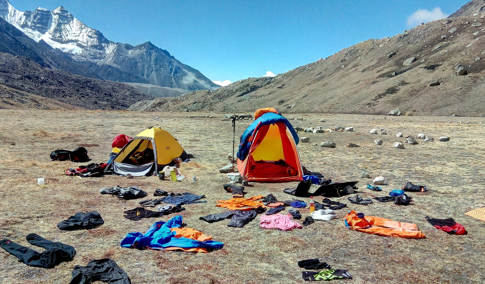 Bis zum Moment, als auf der grünen Wiese die ersten zwei Biwakzelte wuchsen, die von zwei Köchen, zwei Trägern und zwei Teilnehmern, also mir und Hook, besetzt wurden, ging alles wie auf Schnürchen. In demselben Moment kam auch ein Rücken angelaufen, der uns als einziger nicht wehtat. Da traf Antenzing Sherpa ein, der den 20 kg schweren Rucksack mit Kletterausrüstung trug. Nachdem er die Last abgeladen hatte, drehte er sich auf der Stelle um und verschwand wieder. Wir blieben mitten in den Bergen ganz allein. Ein wunderschöner ruhiger Platz ohne Menschen, umgeben von schneeweißen Kämmen wilder Berge.