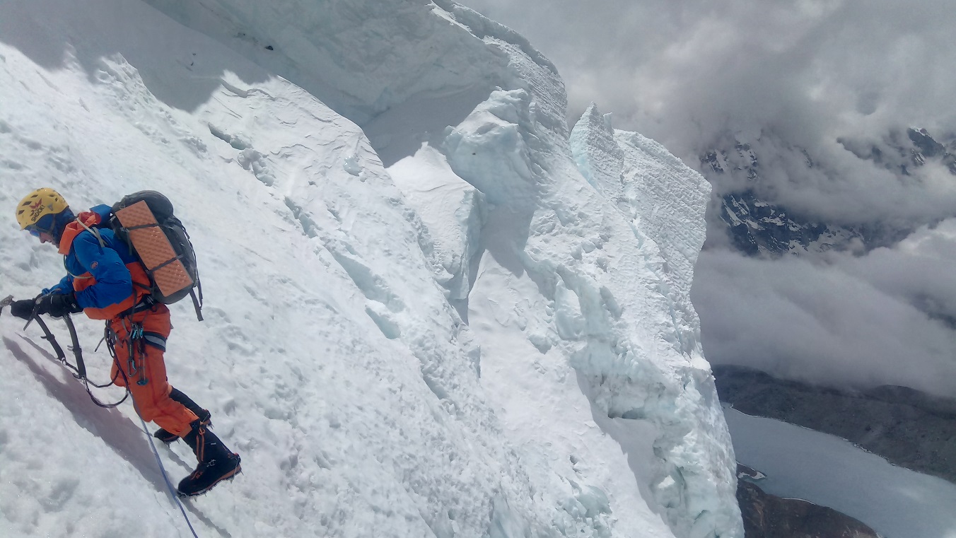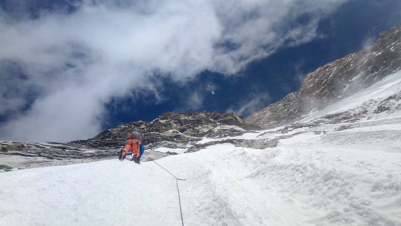 Am vierten Morgen konnten wir unsere Körper nur schwer in Gang bringen. Gleich die ersten Meter führten über Felsschwellen, die altes hartes Eis ausfüllte. Die Spitzen zu überreden, dass sie halten, kostete viel Kraft. Nach 100 m folgte das, was wir schon am Vortag ausprobierten. Eisfirn in einem Winkel von 70°, stellenweise auch mehr. Es schien, als würde der Berg vor uns ständig wachsen, statt kleiner zu werden. Irgendwo muss aber auch er ein Ende haben. Und richtig. In den Nachmittagsstunden überwanden wir den letzten Aufschwung und plötzlich standen wir auf einem scharfen First, der uns einen außergewöhnlichen Anblick der Welt auf der anderen Seite bot. Es war sehr windig und die Temperatur sank tief unter Null.