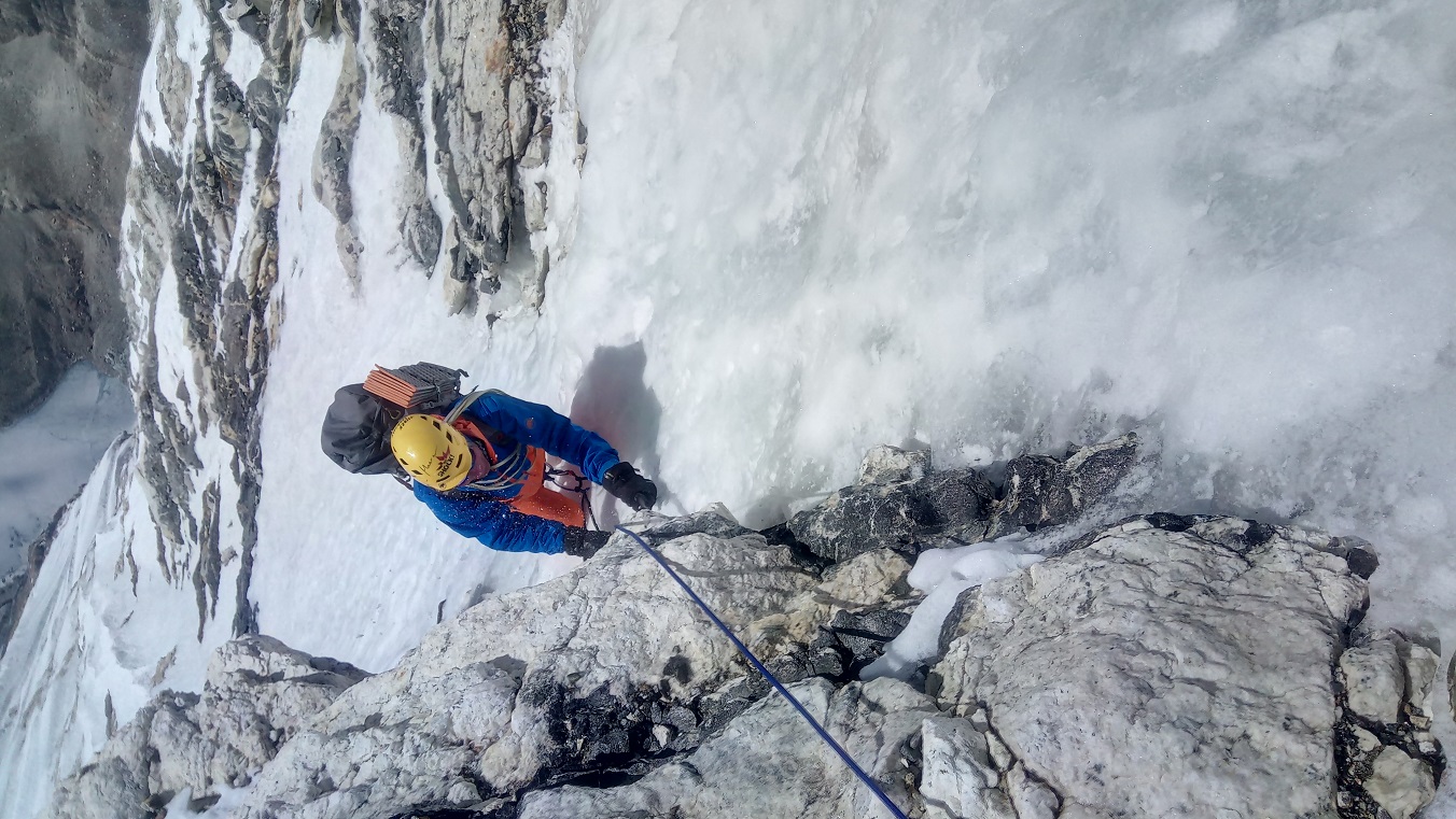Ein sehr kaltes Schlaffleckchen. Die Eismasse strahlt keine Wärme aus, das ist klar. Die vorherigen ein paar Dutzend Meter hatten jedenfalls ihren Zauber. Exponiertes schweres Klettern mit wachsender Tiefe unter den Füßen. Die Lungen konnten dabei rechtzeitig Luft schnappen, für das Bergsteigerherz also ein wirklich schönes Erlebnis.