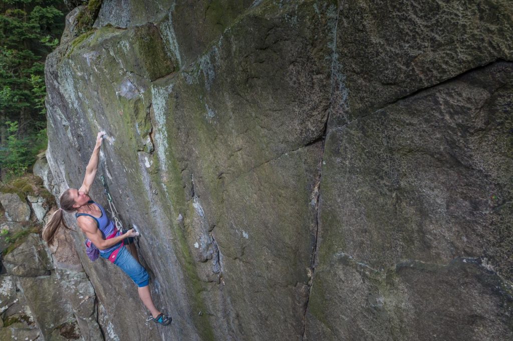 Sehr lange konnte der für Harzer Verhältnisse ungewöhnlich steile Route „Sidewinder“ (10-) am Ziegenrücken Anjas Belagerungswelle standhalten. Nötig war ein intensives Aufbautraining denn schlechte Leisten, noch schlechtere Tritte und eine grenzwertige Clipposition fordern auf wenigen Meter den ganzen Mann – oder wie in diesem Falle die ganze Frau. Das dürfte wohl die höchste im Harz von Frauen je begangene Schwierigkeit sein, Yeah, Gratulation!