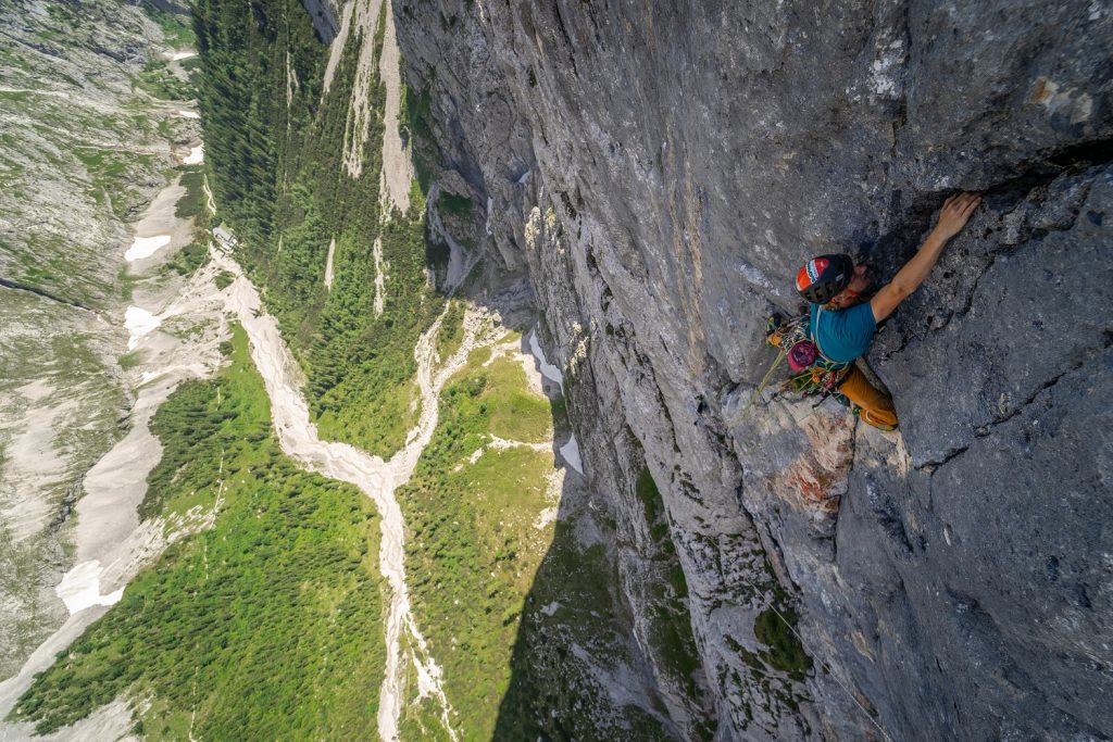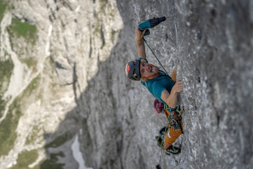 Ebenfalls 2015 stieg Martin kurz vor seinem 18. Geburtstag etwas weiter rechts der „LoGa“ alleine in die Wand ein, gesichert mit einem 2er GRIGRI®, an dem er ein bisschen rumgefeilt hatte. Ohne viel Ahnung, was er bei seinem Projekt so brauchen würde, wurde gepackt bis der Rucksack voll war, nur ohne Schlafsack oder Matte. Am dritten Tag – nach einer Nacht in der Almwiese und einer weiteren auf einer Holzbank in der Höllentalangerhütte liegend – hatte Matin dann nach gut 200 Metern keinen Saft mehr. Und die Bohrmaschine auch nicht.