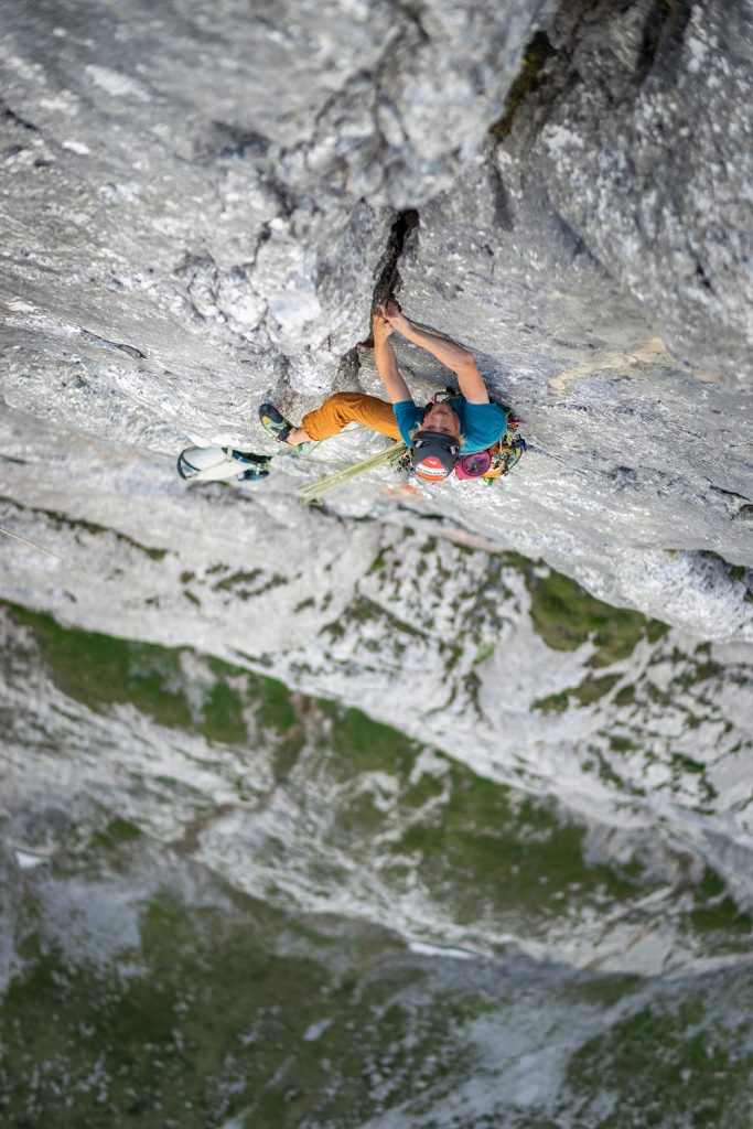 Eine Woche später bricht Martin zum 6. Mal in die Wand auf, diesmal wird sein Treiben photographisch von Silvan Metz begleitet. Die Ausstiegsrisse generieren die einzigen Flugmeilen, dank Faktor zwei in den Standplatz reicht’s damit dann aber auch. Nun folgen die Rotpunkt-Versuche, im Stilbruch zu zweit – Martin hatte aber einfach keine Lust mehr, alleine in dieser wunderschönen Wand herumzuhängen – gemeinsam mit Matze Schlosser und zwei Tage später erfolgreich bis zum Gipfel mit Janina Reichstein:-)