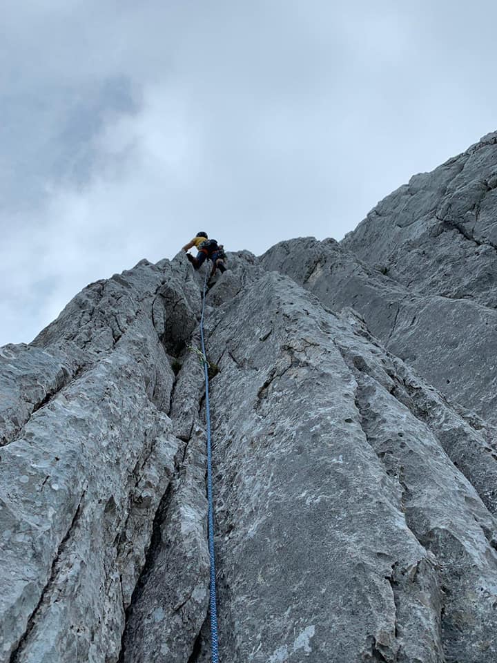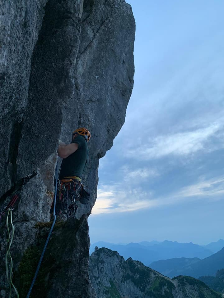 Trotzdem, deswegen oder erst Recht ging’s im Morgengrauen zur Predigtstuhl Westwand, „Direkte Nordwestrisse“ – Julius berichte. Viel (mehr) gibt’s nicht zu sagen (ausser vielleicht, dass man irgendwie zur mehr oder weniger offensichtlichen Schwachstelle im Wandriegel nach dem Ostler-Zustieg finden muss, danach einfach den H und schönsten Rissen nach… und dass alle Stände mit 2 neuen Schlaghaken markiert wurden), daher Zitat Philipp: „war ja wohl die geilste Seillänge bisher im Kaiser“ …das spricht für sich (bzw. für die Route) ?! Um 11:00 stehen wir im Bonzog-Kessel, Nebel zieht um die höchsten Kaisergipfel, die Westkante am Südgipfel wird gegen pünktlich heim kommen eingetauscht…mal wieder… was auch das Stichwort bleibt: wir kommen Mal wieder!