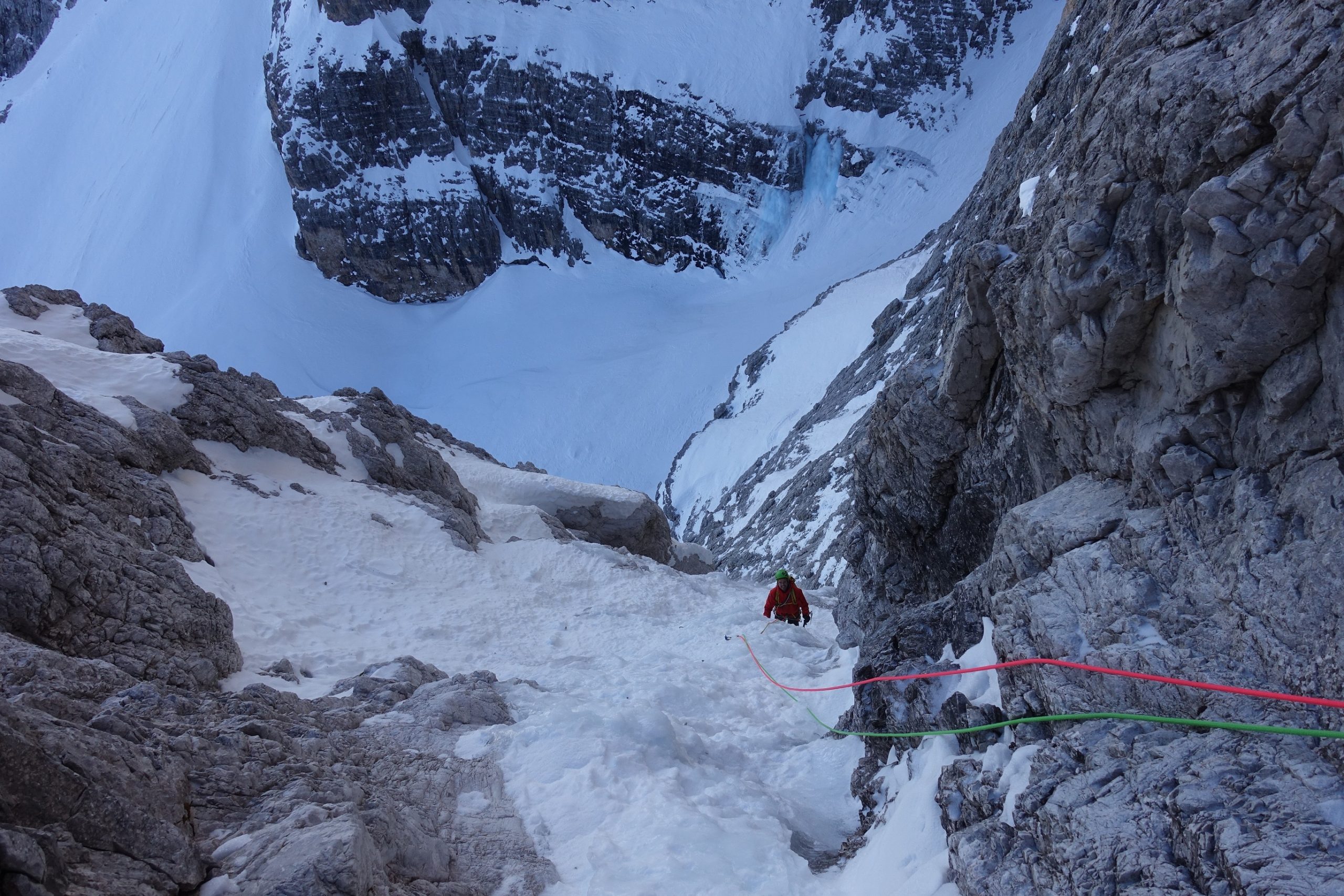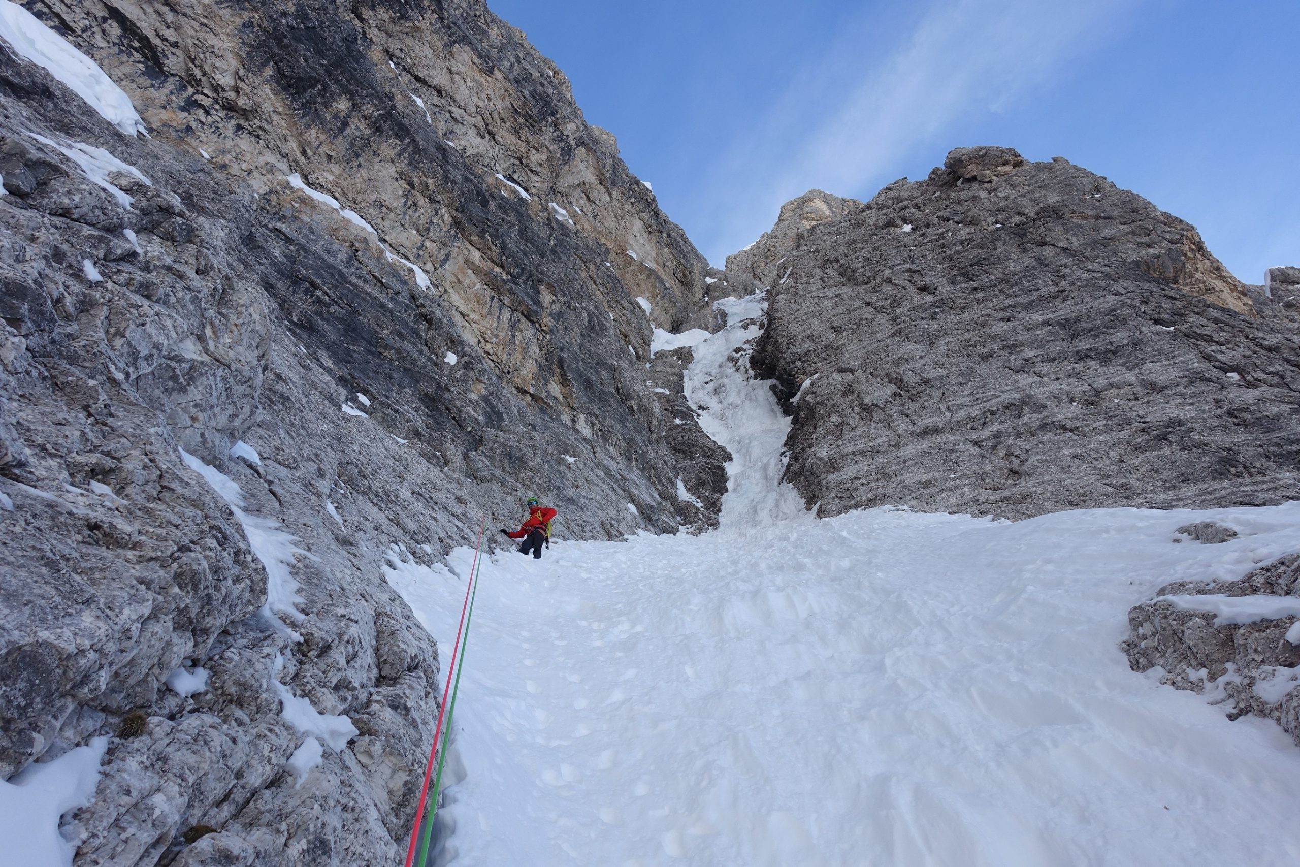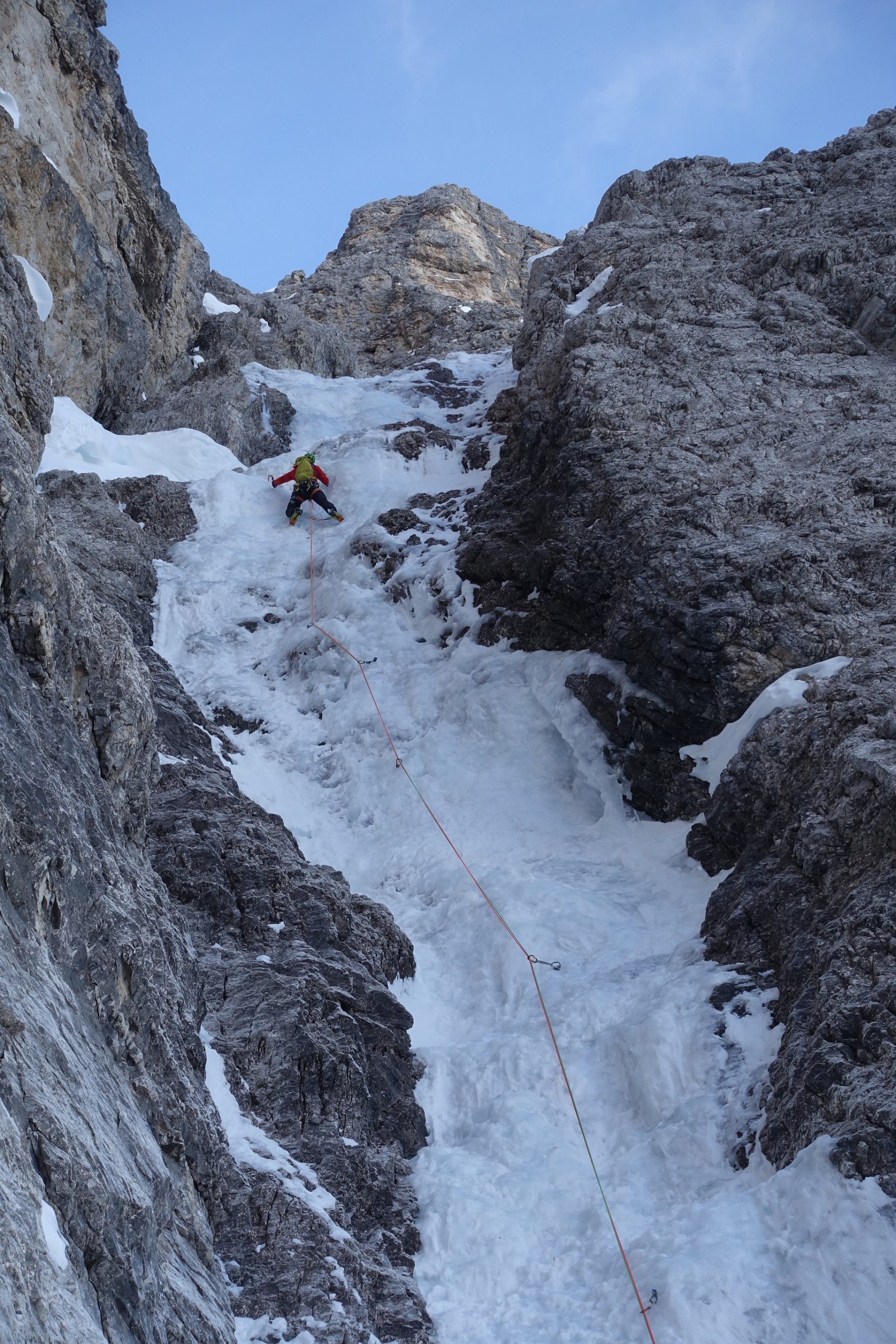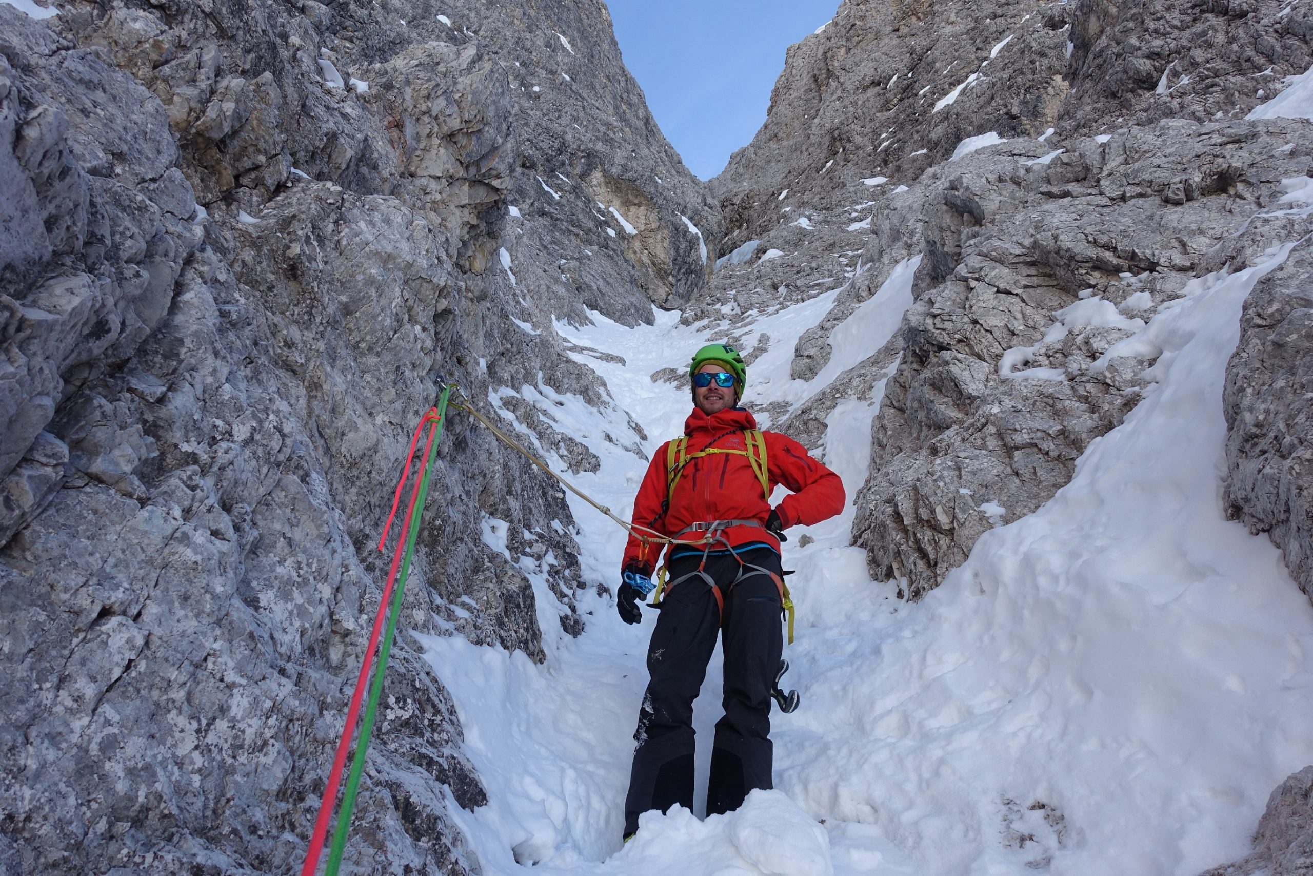 aufsteigen, da man vorher das Couloir nicht sehen kann. Dort angekommen sah ich genügend Eis, um einen Versuch zu wagen. Mit meinem Seilpartner, Hannes Egarter, ebenfalls Bergführer aus Sexten, bin ich am nächsten Morgen gestartet. Bereits gegen Mittag standen wir nach circa 600 Klettermetern im Schnee und Eis auf der Mitria, dem Vorgipfel des Zsigmondykopfes. Das Klettern im Couloir ging wesentlich besser voran als erwartet. Lediglich eine anspruchsvollere