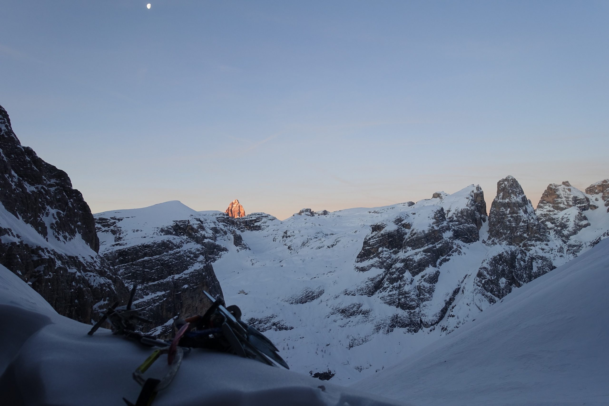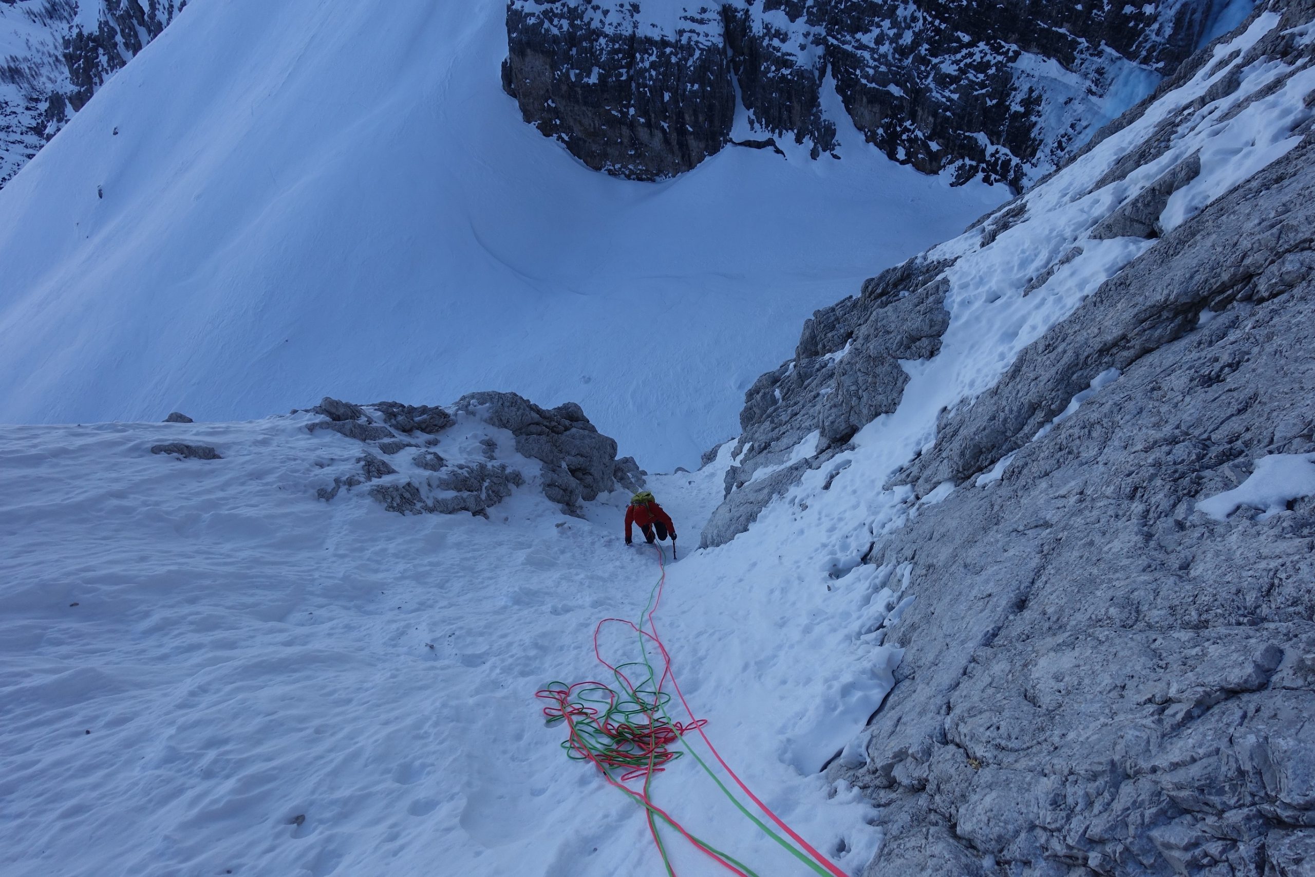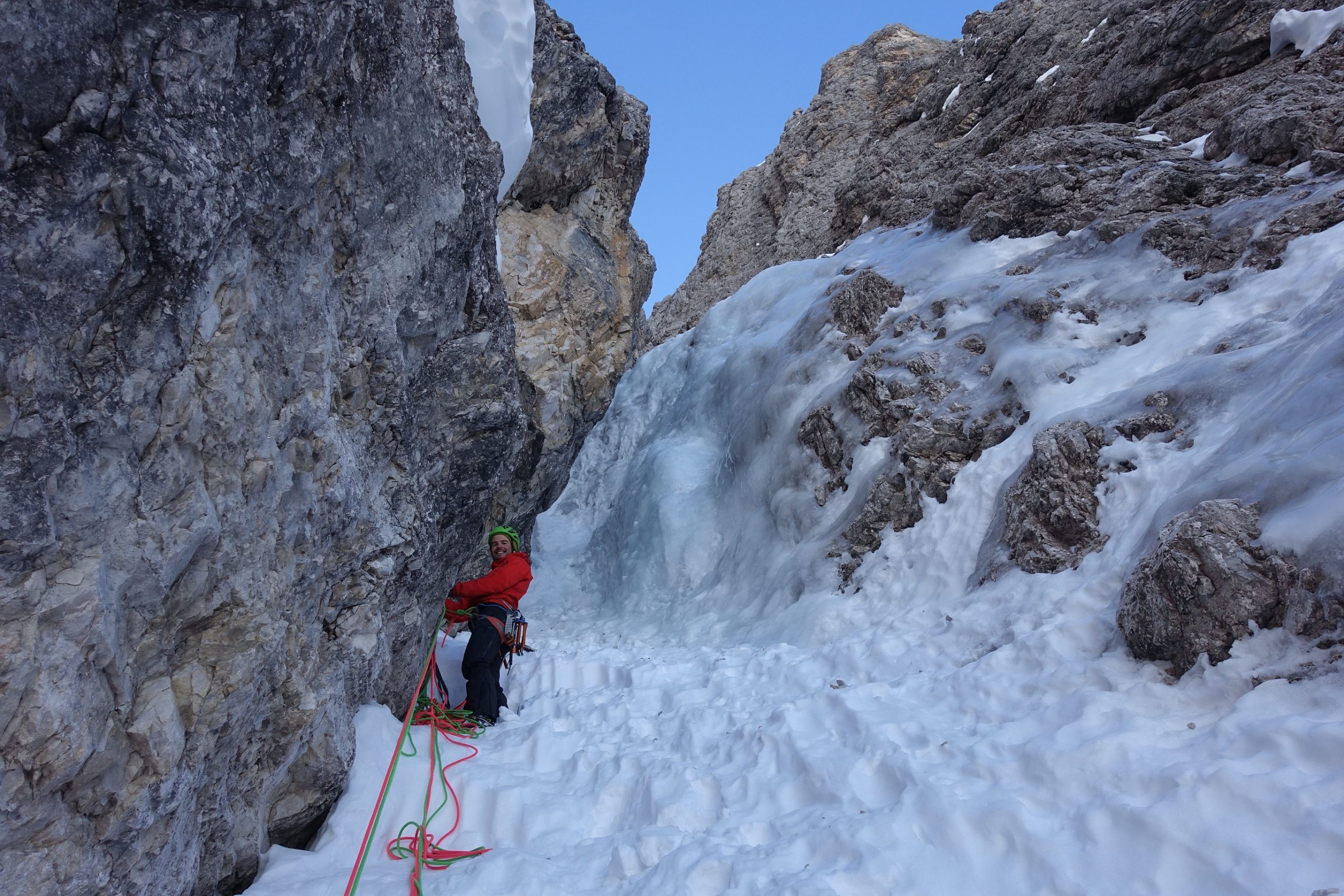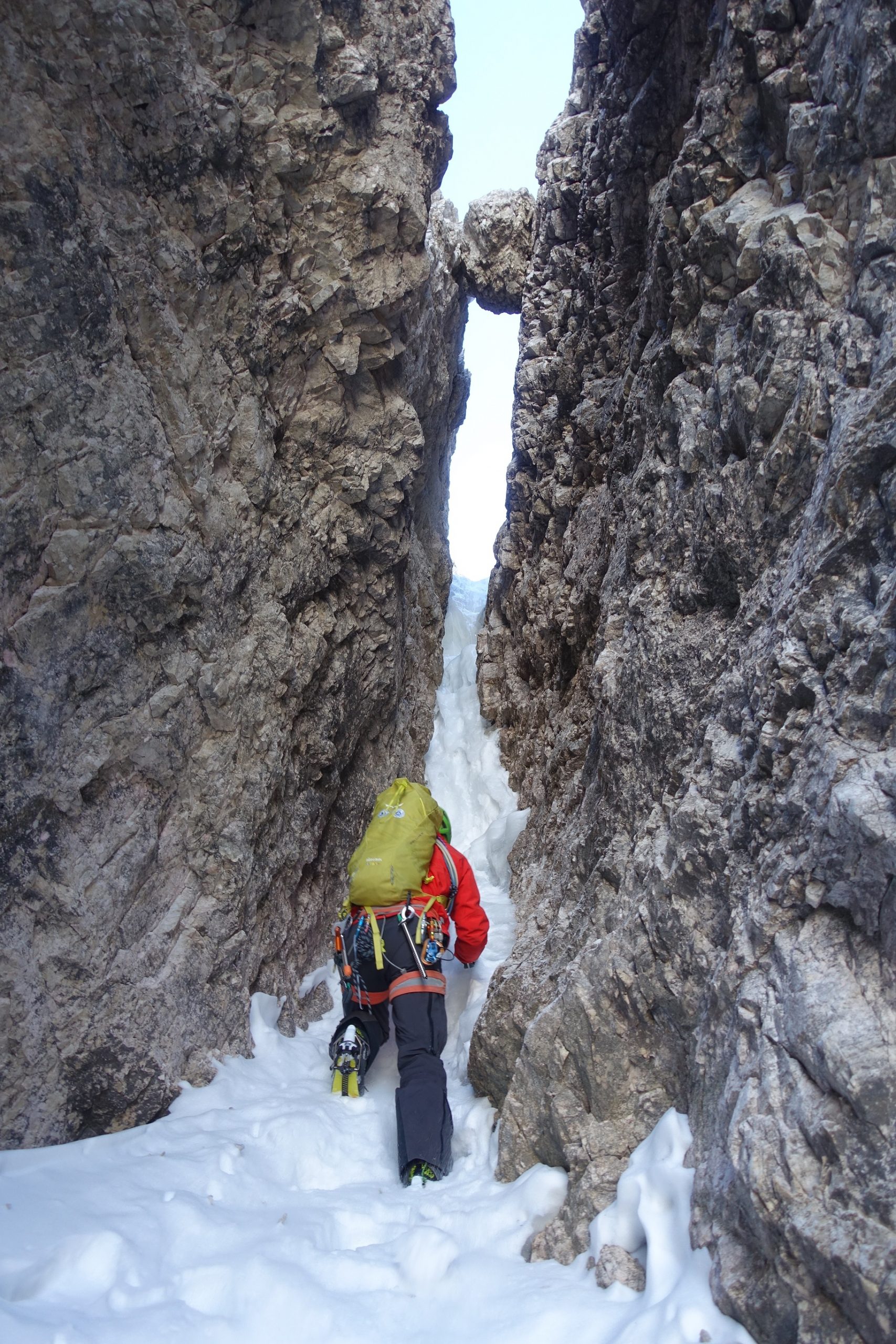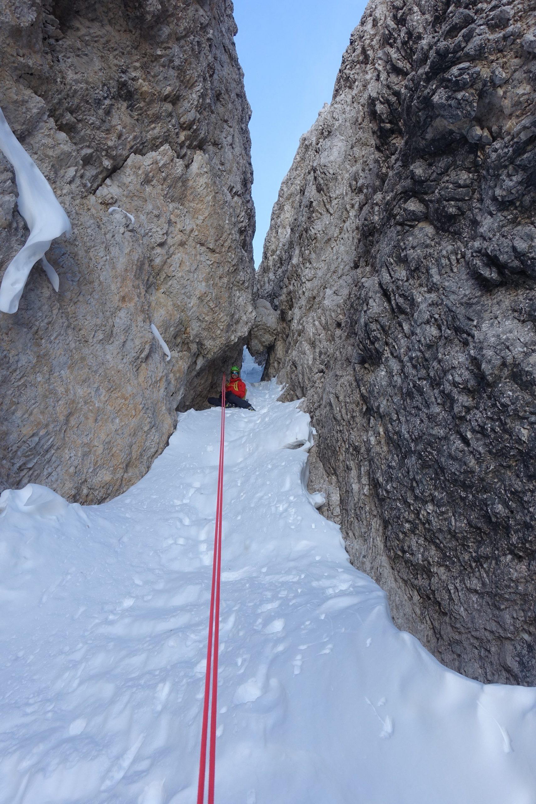aufsteigen, da man vorher das Couloir nicht sehen kann. Dort angekommen sah ich genügend Eis, um einen Versuch zu wagen. Mit meinem Seilpartner, Hannes Egarter, ebenfalls Bergführer aus Sexten, bin ich am nächsten Morgen gestartet. Bereits gegen Mittag standen wir nach circa 600 Klettermetern im Schnee und Eis auf der Mitria, dem Vorgipfel des Zsigmondykopfes. Das Klettern im Couloir ging wesentlich besser voran als erwartet. Lediglich eine anspruchsvollere