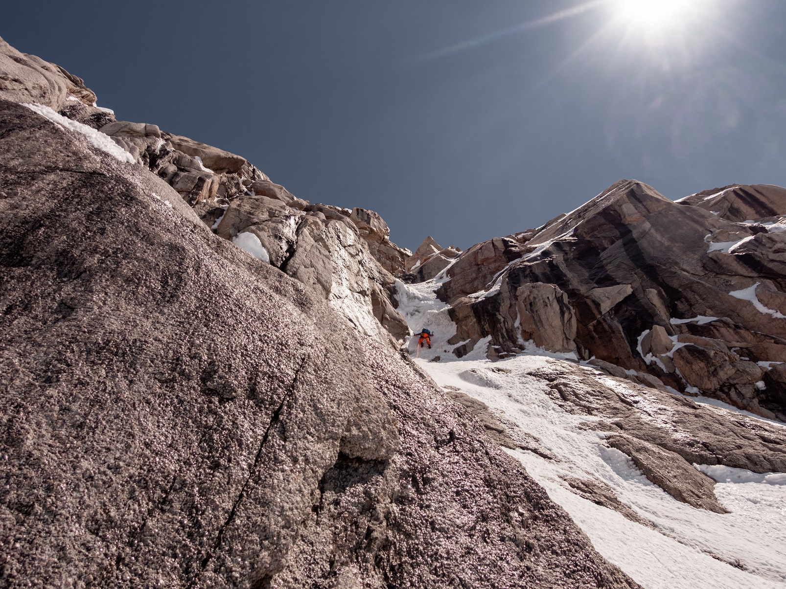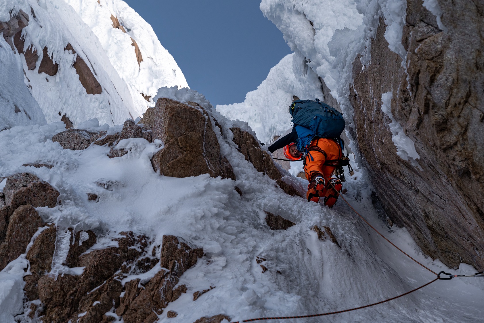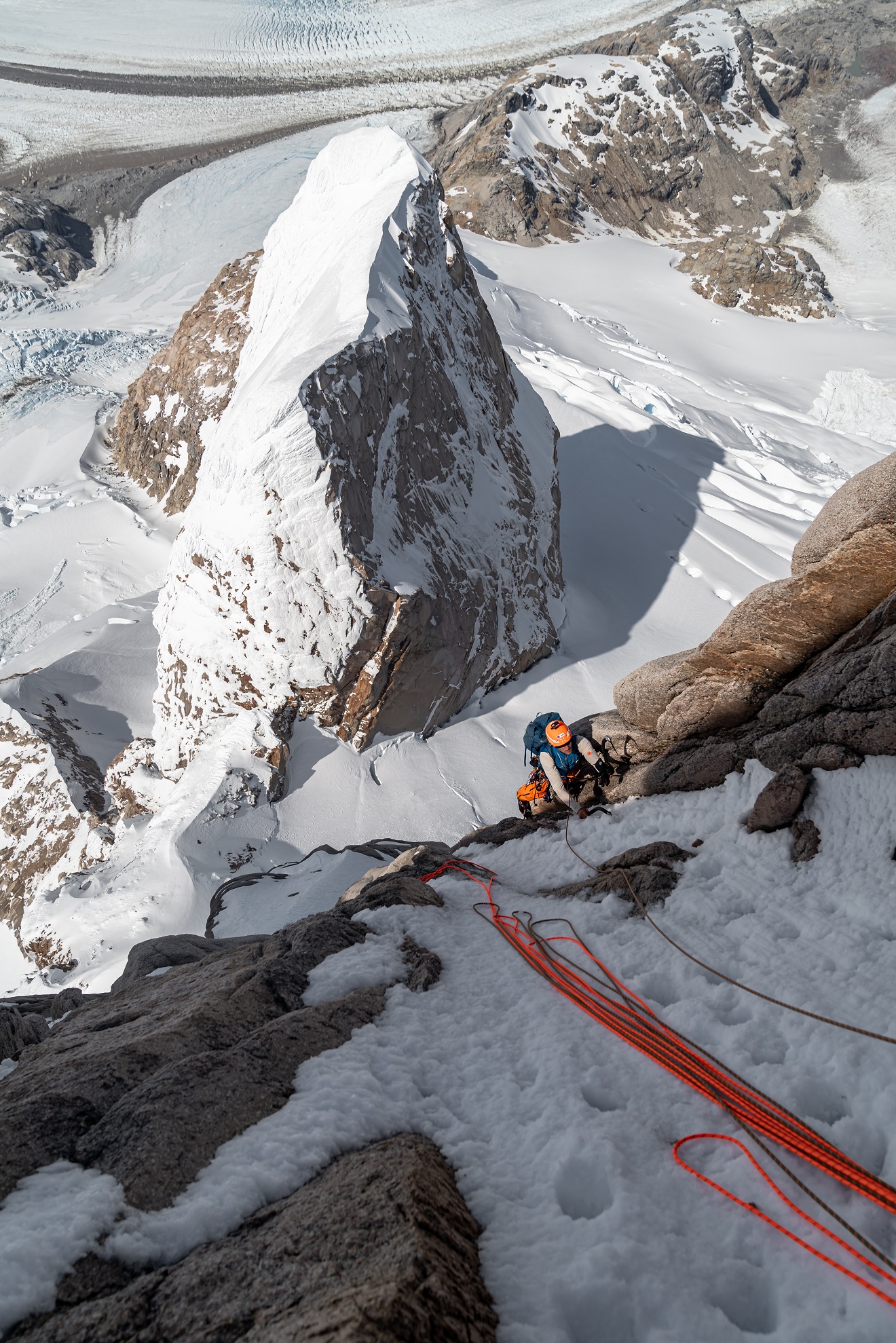 Dass die Nordostwand des Cerro Cachet noch unbestiegen war, liess uns nicht mehr los. Ein paar Tage später gab es die Aussicht auf stabiles Wetter für mehrere Tage und wir starteten unsere Mission Cachet. Nach mehreren Stunden Fußmarsch über den Nef-Gletscher bis zum Wandfuss, mussten wir am zweiten Tag das schlechte Wetter im Zelt von unserem ABC aussitzen. Am dritten Tag ging es aber los: Unsere Route führte über eine vereiste Rampe hoch auf einen Rime-Eis gespickten Pass, wo wir nach einer kurzen Abseilstelle und einem Gegenaufstieg direkt unter die rund 600 Meter hohe Headwall gelangten. Eine senkrechte und wilde Eislinie markierte die logische Linie, doch nach einer gekletterten Seillänge mussten wir bereits nach links in den Felsen ausweichen. Die Sonne verursachte mehr Eisschlag als uns lieb war. Seillänge um Seillänge fanden wir jedoch einen kletterbaren und objektiv sicheren Weg durch sehr schönes und spannendes Mixedgelände. Die schwierigsten Längen – wir stuften sie mit M7+ ein – konnten wir mit Friends und Normalhaken absichern. Doch einige Seillängen führten über dünne und steile Eisauflagen – die darunter liegenden Hohlräume erforderten ein solides Nervenkostüm.