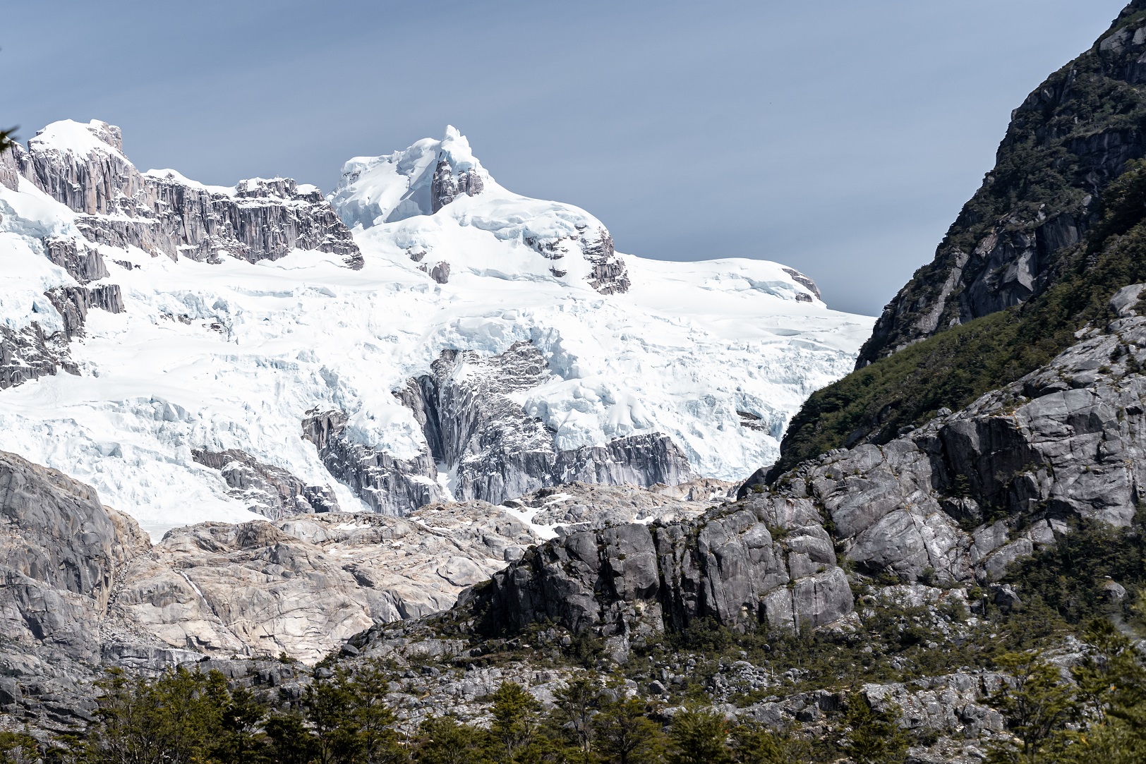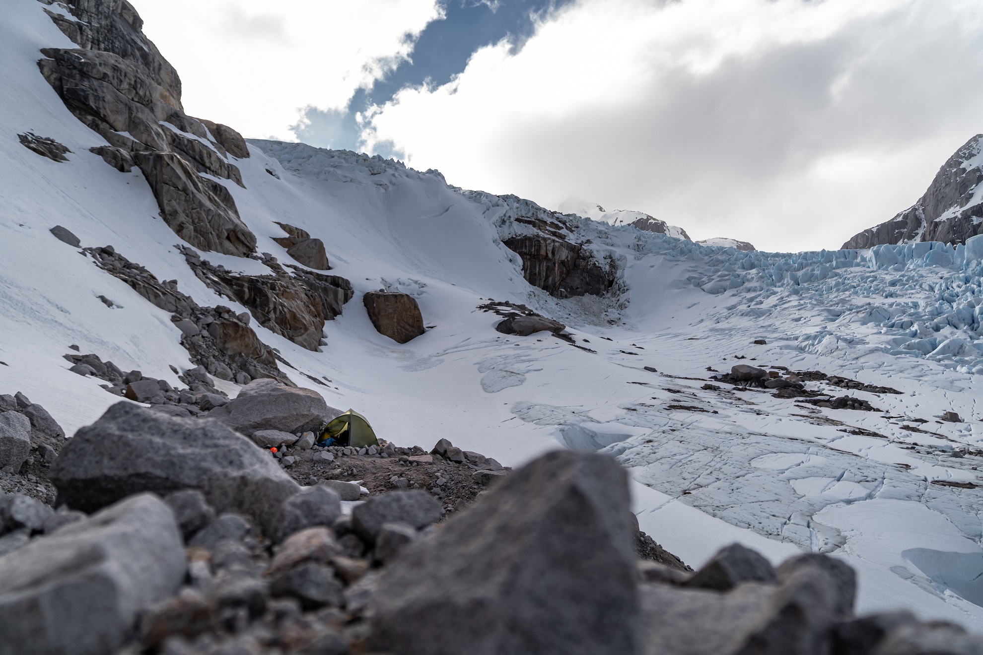Unser Blick ging aber nicht nur gen Westen zum Pazifik, auf der anderen Seite stach uns die markante Nordostwand des Cerro Cachet ins Auge. Der rund 2600 Meter hohe Berg war seit der Erstbesteigung im Jahr 1971 durch neuseeländische Bergsteiger erst ein weiteres Mal erklommen worden, beide Mal über die recht einfache Rampe vom Inlandeis aus. Aber es gab noch keine Besteigung über die senkrechte Nordostwand – unsere Challenge für das nächste stabile Wetterfenster.