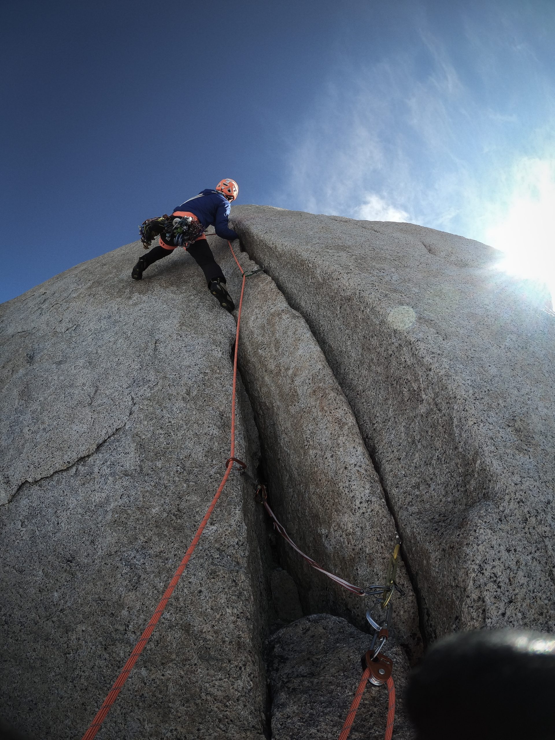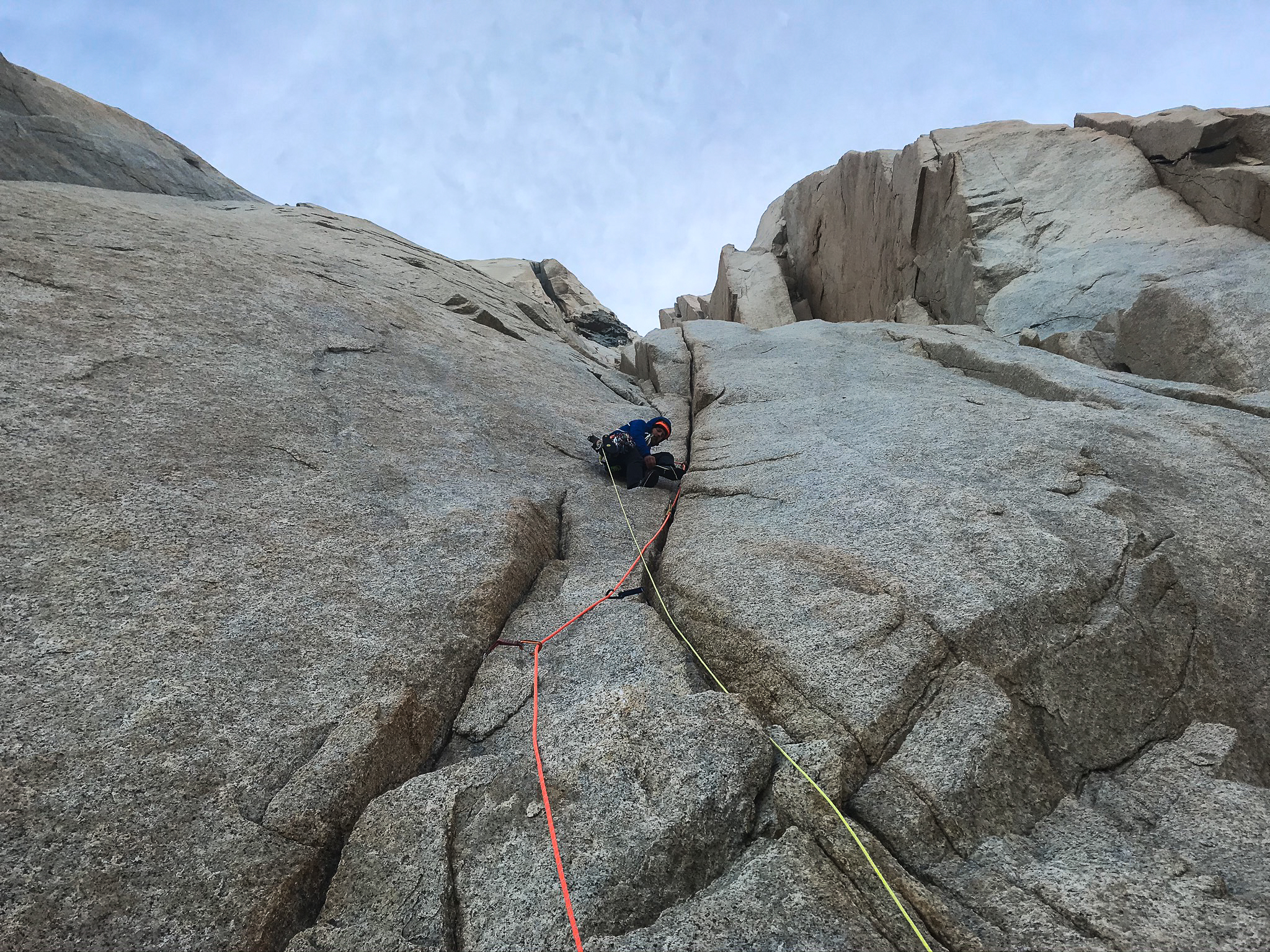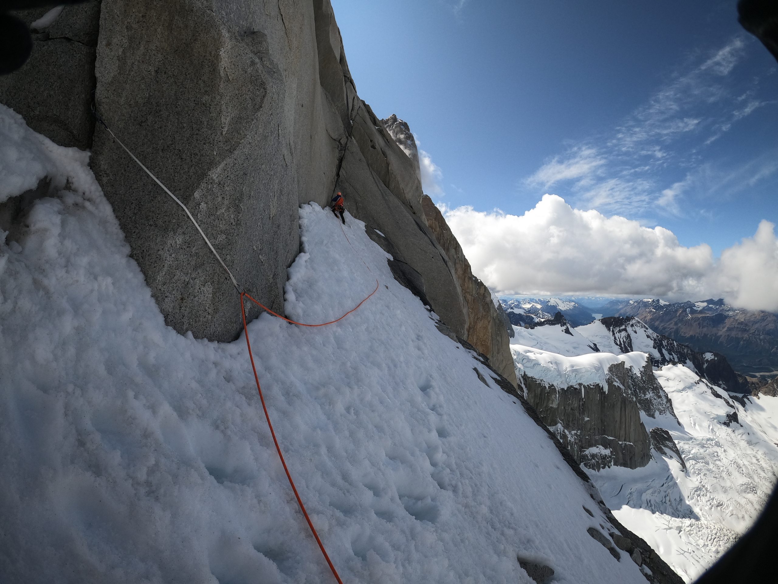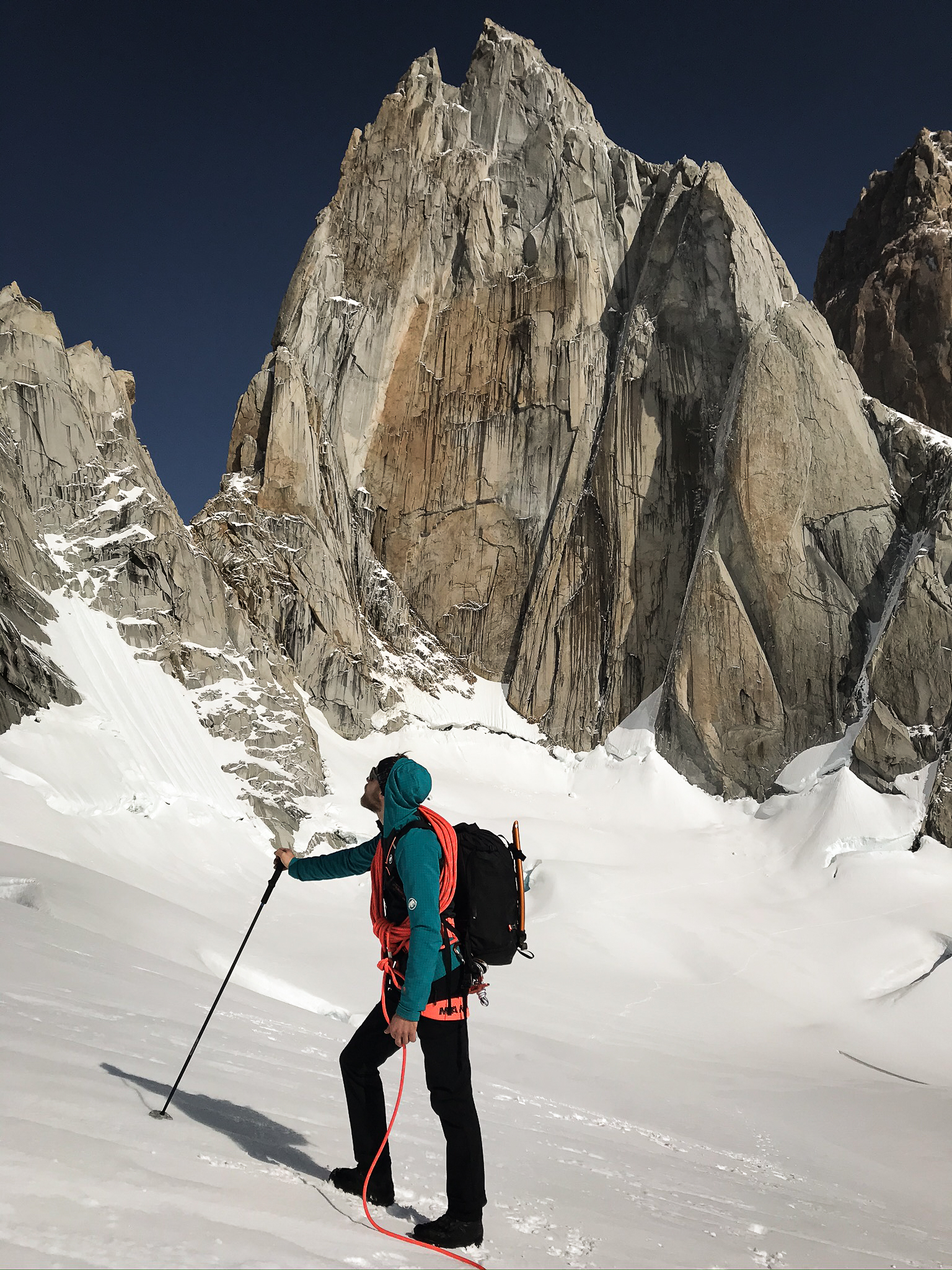 Am ersten Tag ging`s die 20 km rein ins Campo Polacos vis-à-vis der Torre Gruppe. An den folgenden drei Tagen überschritten wir die drei Gipfel Aguja de l’S, Aguja Saint-Exupéry und Aguja Rafael. An der Saint-Exupéry mussten wir auf die Nord West Wand ausweichen, da es immer noch zu viel Neuschnee auf der Schattenseite hatte und sehr kalt war. Es waren drei unglaubliche Tage mit super Kletterei, schönen Biwaks und wilder Abseilerei. Leider war es sehr kalt und der viele Schnee machte ein schnelles Vorankommen in dieser Exposition teilweise unmöglich. Dies war auch der Grund, weshalb wir uns entschieden bei diesen Bedingungen nicht mehr in die gewaltige Südwand der Poincenot einzusteigen. Nach fünf Tagen in den Bergen waren wir in Chalten froh über eine warme Dusche, gutes Essen und einige Tage schlechtes Wetter zum Erholen. Nach einem solch aussergewöhnlichen Wetterfenster waren wir nicht sicher ob wir nochmals eine Chance auf ein weiteres kriegen. Doch wir hatten Glück und eine weitere Hochdrucklage wurde prognostiziert. Das hiess; nochmals Planen und hoffen die richtige Tour in der richtigen Exposition und höhe auszuwählen. Im vergleich zum letzten Mal, waren wärmere Temperaturen angesagt, jedoch gab es in den Tagen zuvor wieder super viel Schnee in der Höhe. Somit entschieden wir uns eine neue Linie an der Ostwand des Torre Eggers zu versuchen, welche viel Sonne kriegt und auch vom Wind etwas geschützter ist. Doch als wir am ersten Tag unter der Wand standen mussten wir akzeptieren, dass die Ostseite deutlich mehr Schnee bekommen hat als das letzte Mal und unser eigentliches Vorhaben nicht möglich ist. Kurzfristig war die Stimmung schlecht. Beim Abstieg sahen wir, dass die West Seite der Fitz Roy Gruppe diesmal deutlich trockener aussah. Bei warmen Temperaturen ist so das Klettern im Schatten sicher auch angenehmer. So entschieden wir uns doch noch bei der letztmals angefangenen Überschreitung weiter zu fahren. Am nächsten morgen stiegen wir beim ersten Tageslicht in die 900m lange Fonrouge Rosasco in der Südwand der Poincenot ein. Bereits nach den ersten 100m kamen wir an eine Verschneidung wo ein Wasserfall runter lief. Grossartige Morgendusche! Mit kühlem Kopf ging`s in unübersichtlichem Gelände weiter. Teils durch klassische Kamine, teils perfekte Splitter. Die steilste Wandstelle im oberen Teil hatte viel Schnee in den Verschneidungen, welche wir in unangenehmer Kletterei in brüchigem Felsen umgehen mussten, was das ganze deutlich anspruchsvoller und langsamer machte. Der obere Teil führt einem in moderater Kletterei in die klassische Whillans-Cochrane Route, über welche wir in zwei simultan gekletterten Längen den Gipfel erreichten. Was für ein Gefühl auf dieser Nadel den Sonnenuntergang geniessen zu können, mit Blick auf das Innlandeis, die Torre Gruppe, den Fitzroy und El Chalten. Das Abseilen in der Nacht, über die Whillans Rampe ging ziemlich flott. Der Abstieg über den Gletscher runter zur Languna de los Tres war dann alles andere als angenehm; Ständig sanken wir bis zur Hüfte im durchnässten Schnee ein. Zum Schluss war noch ein 10km langes morgen Footing nach Chalten angesagt, wo wir genau 24 Stunden nach dem Einstieg ein feines Schnitzel genossen. Nicht selbstverständlich um 7 Uhr morgens.