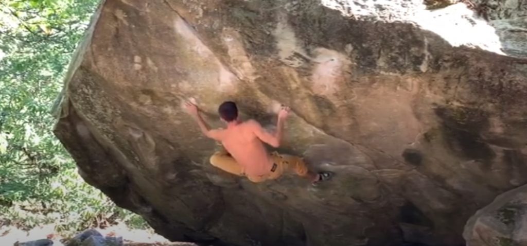 J’ai commencé à faire des séances dans ce bloc après l’enchaînement d’Oriane Bertone au mois de mai. J’ai toujours trouvé ce bloc dément avec un gros dévers bien imposant. Il était difficile pour moi de faire la méthode d’Alban Levier, du coup quand Oriane a trouvé une nouvelle méthode cela m’a tout de suite motivé à venir y mettre les doigts. J’ai dû faire 6 à 10 séances entre le mois de mai et le mois de juillet. En juin, je suis parvenu à faire le départ debout en 8B+. À partir de là, j’ai commencé à mettre des essais du bas, mais la chaleur ne m’a pas facilité les choses et même en y allant très tôt il faisait déjà plus de 25°C à 8h. Mes séances pouvaient s’arrêter après seulement 4/5 essais car avec la chaleur, je me coupais l’index droit très rapidement ! Je dirais que ce bloc est un des plus techniques que j’ai pu réaliser. Comme on peut le voir, il faut avoir une bonne tenue de prise mais pas que, il faut également être souple et très précis dans sa grimpe. Tout se joue dans les micro-détails: placement du talon au millimètre, placement des doigts dans le verrou à la perfection… Sinon, impossible de faire le mouvement suivant. C’est tout cela qui permet de se sentir bien dans les essais ou au contraire d’avoir l’impression que c’est impossible. Ce mercredi, après 1 mois et demi de pause dans ce bloc, j’y retourne sans aucune attente. Les températures sont bien redescendues comparé au mois de juillet. En quelques essais je parviens à refaire le départ debout et après 2 essais supplémentaires je l’enchaîne ! C’est toujours bien sympa d’être récompensé de ses efforts et du temps passé. Concernant la côte est-ce que c’est 8C ? Ce n’est pas le 8C le plus dur que j’ai pu faire mais il correspond en tous points à mes qualités physiques : des arquées, une ouverture de bassin, des pieds dans les dents, donc difficile à dire. À voir ce que d’autres répétiteurs diront… Maintenant place à d’autres projets en forêt, mais j’avoue que je n’ai pas encore choisi dans quoi m’investir. La priorité est de venir à bout de « Super Crakinette » 9a+ à Saint Leger où je retourne au mois d’octobre en attendant que la saison de compétitions reprenne !