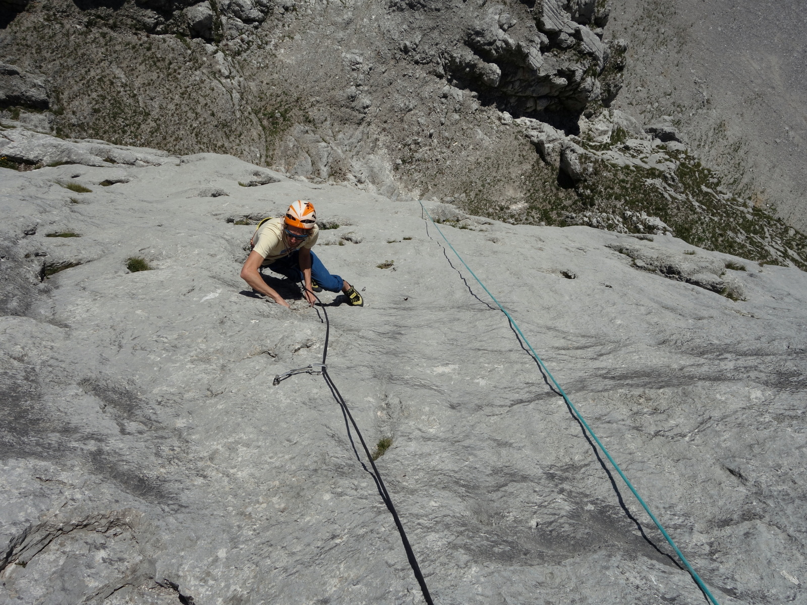 Abstieg: Stände sind zum Abseilen eingerichtet. (60 m – beim 1. und 2. Abseiler Zwischenhaken einhängen!). Wenn oben Schnee liegt, Steinschlag- und Lawinengefahr.