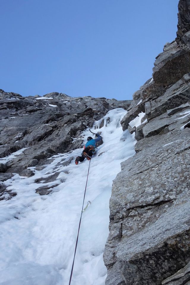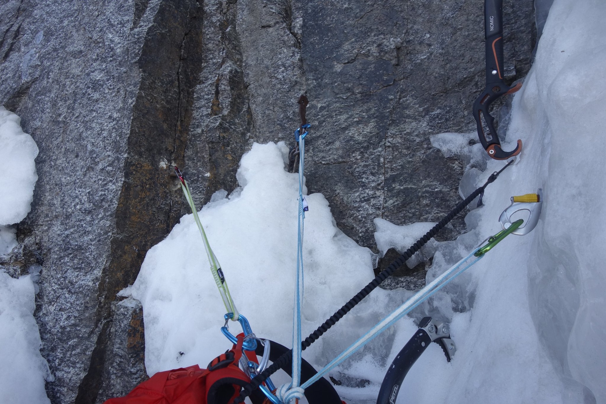 Na jetzt aber… zum Hauptteil. Nach der ersten blutigen Nachsteiger-Nase der Saison war ich dran. Und oh, das schaut ja gar nicht mehr so „flowig“ aus, am anderen Ende des Seils? Ich lege hier einen schlechten Cam, dort eine miese Eisschraube, klettere hoch und runter aber traue mich noch nicht so ganz auf den vollständig gelösten Eisstrukturen zu queren. Irgendwann schlage ich dann noch einen schlechten Haken dazu und weil 3 Mal schlecht mindestens ein Mal gut genug ergibt, geht’s endlich weiter. Nach einer kürzeren Länge von David Bruder ohne fix eingerichtetem Standplatz kommt eine der besten Mixed-Längen der Saison. Fast 50 Meter kombiniertes Gelände mit einer enorm ausgesetzten Querung an den gelösten Eisstrukturen und absolut delikat abzusichern. Wenn’s doch nur so weiter gehen könnte?