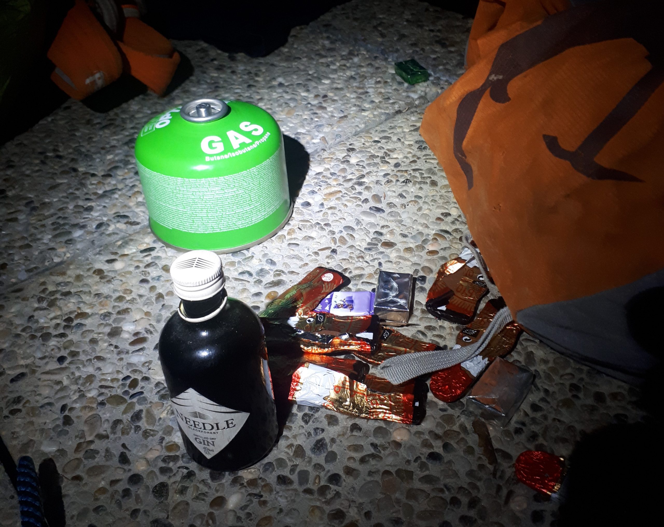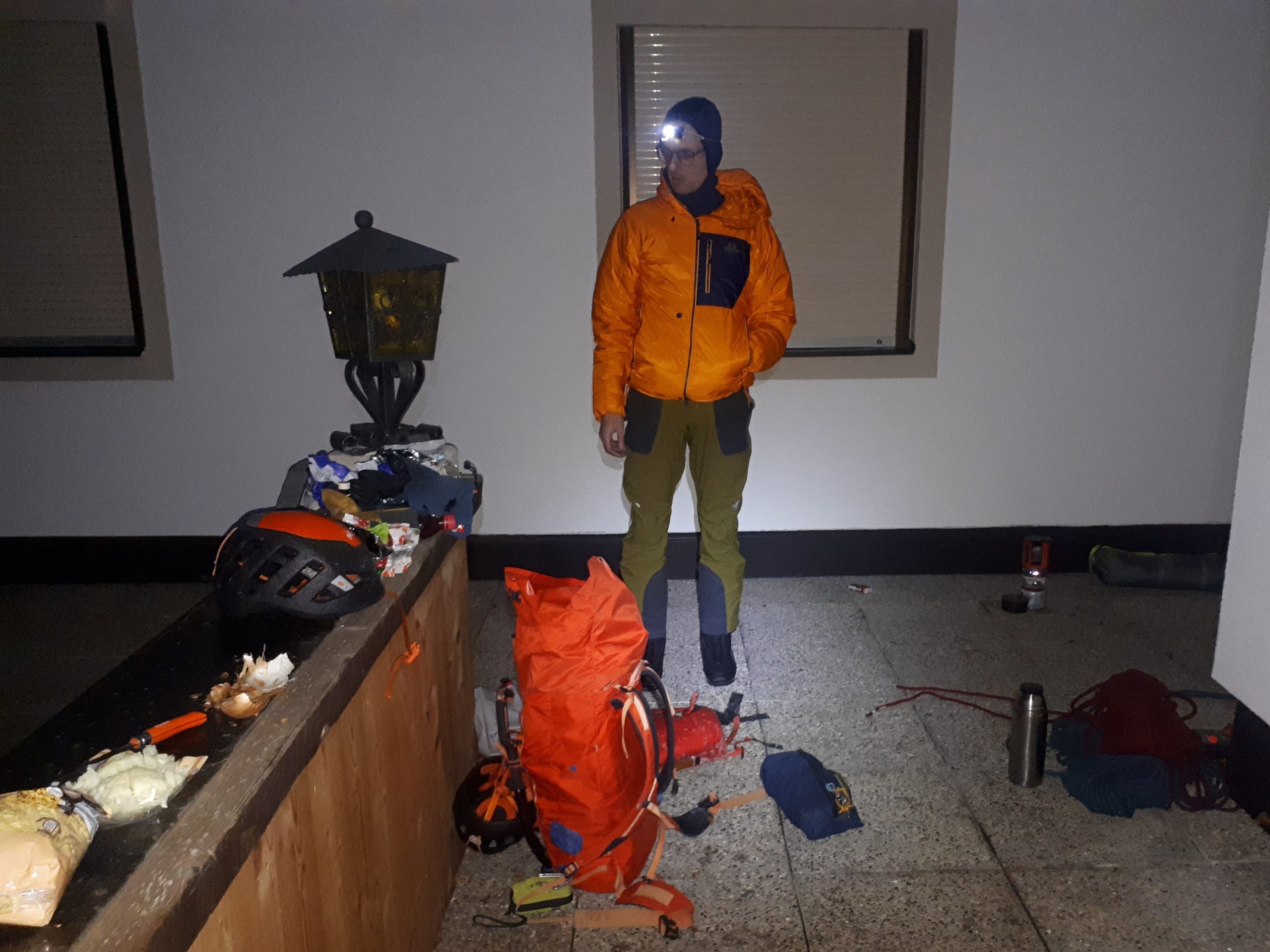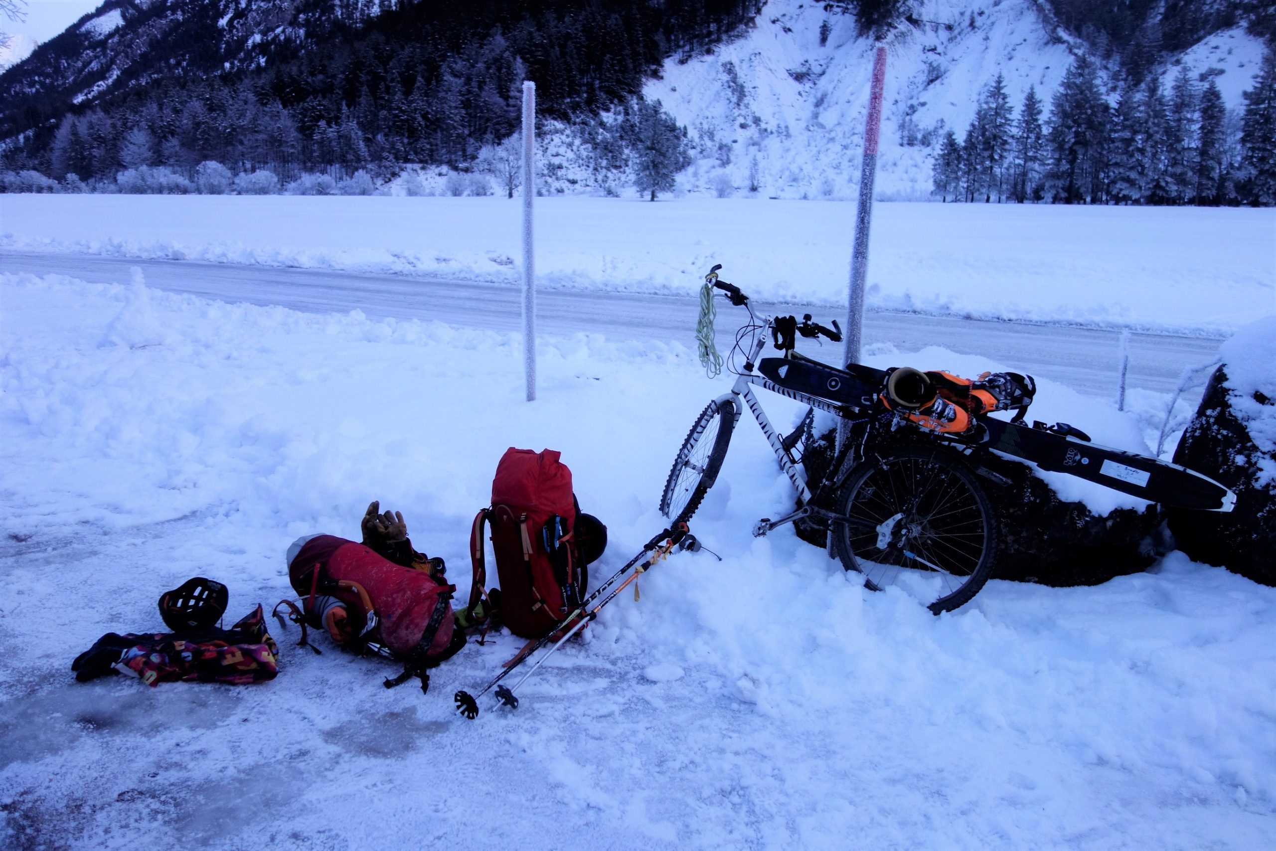 Um noch etwas eure Aufmerksamkeit für den Hauptteil übrig zu haben erzähle ich den sowieso meistens langweiligen Zustieg im Schnelldurchlauf: Mit dem Fahrrad 14 km lang auf eisig eingeschneiter Straße im Schlepptau von Davids E-Bike bis zum Ende der Straße geschlittert, Spätzle mit Maggi-Fix Gulasch gekocht und ein kleiner Schokoladen-Nikolaus, bisschen Ramazotti und ein Kippchen zum Schlafen gehen hinterher. Am nächsten Tag wider Willen aufgewacht und mit Bergstiefeln in der Ski-Bindung und Stöcken ohne große Teller den Talboden etwa 1 Stunde lang bildlich bis unter die Wand gewackelt.