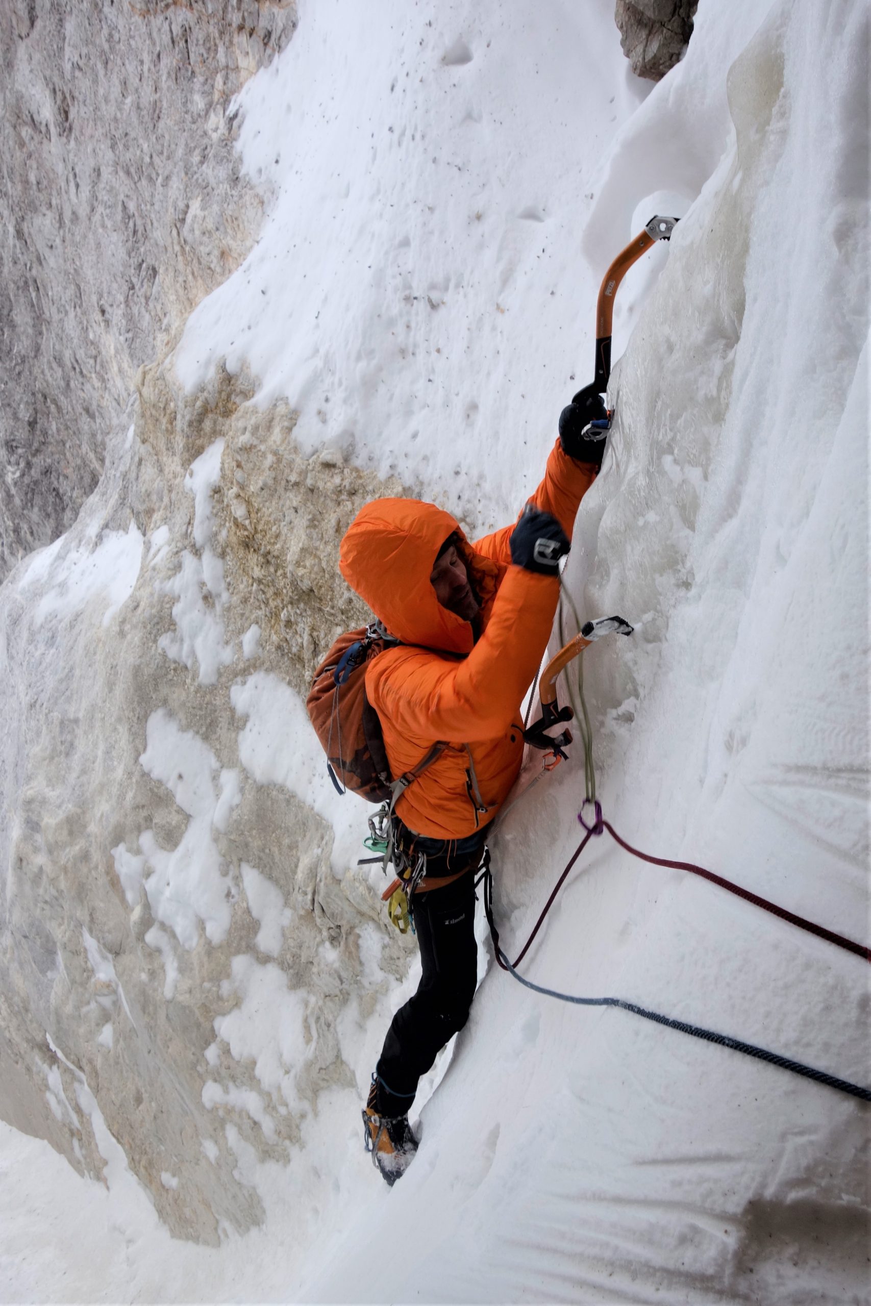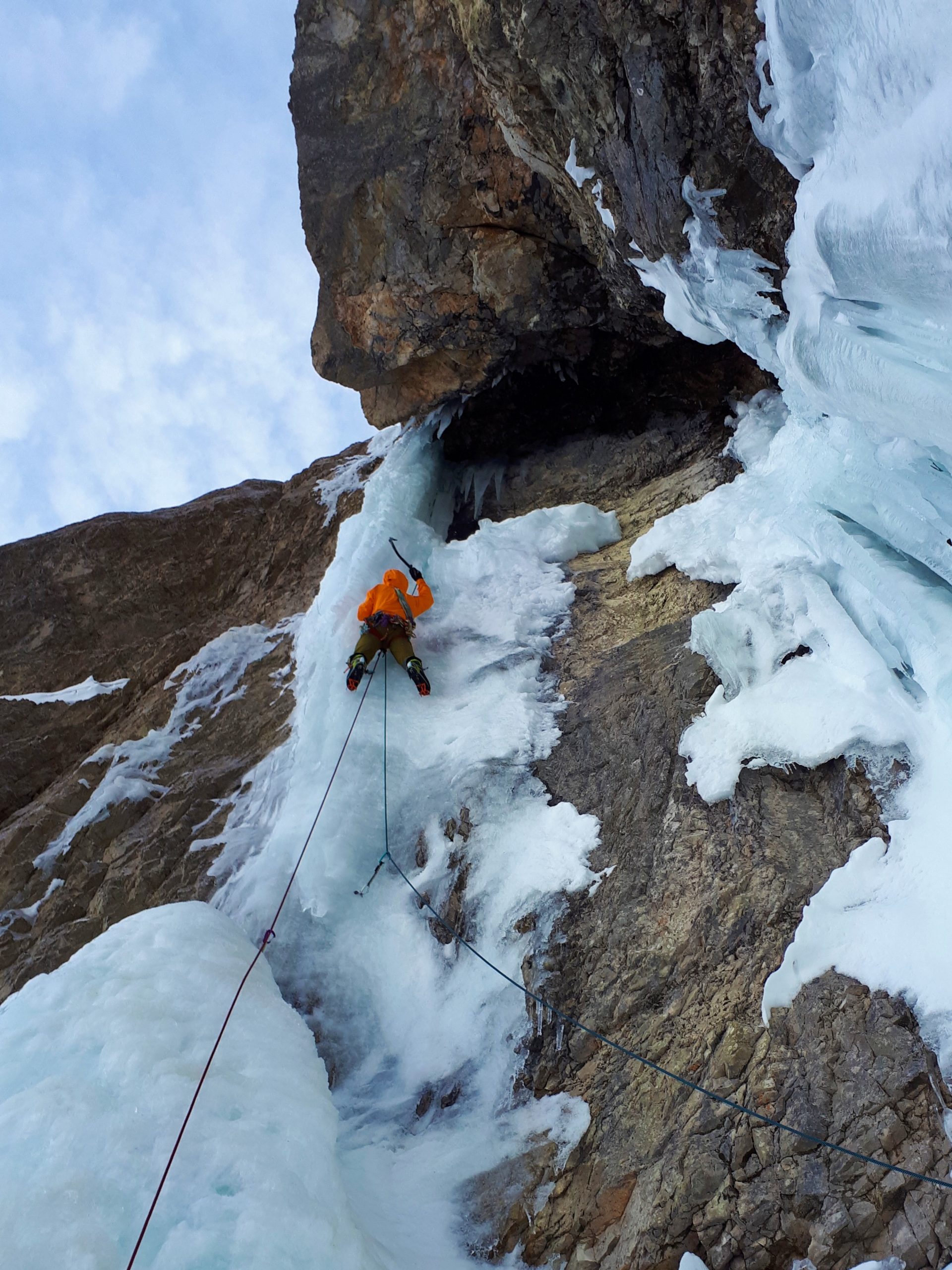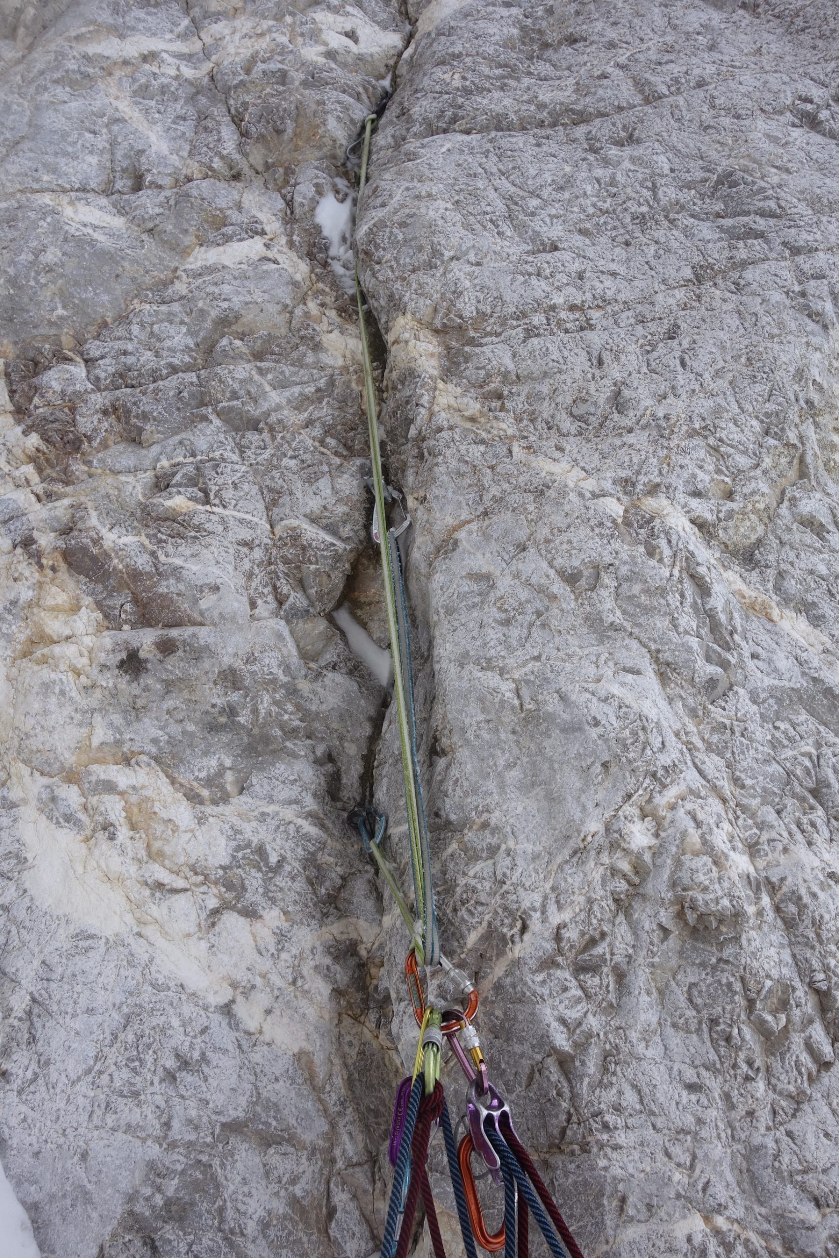 Ich bin mir bewusst, dass bei anderen Verhältnissen in Kombination mit den 3 belassenen sehr guten Haken all das Theater hier lächerlich erscheinen kann. Aber vor dem Hintergrund folgender Superlative, die ihr jetzt einfach Mal ertragen müsst: „Pandora“ (600m, 5, M6, WI6, FODA, FFA), „Cold Fusion“ (950m, 7-, M8, WI5+, onsight), „Sagzahnverschneidung“ (800m, M6, WI6, FFA), „24 hours of freedom“ (300m, M6, WI4, X, FA) wage ich es nochmals an die erwähnte Grenze aus der Einleitung zu erinnern. Ich bin noch nie so völlig im Moment einer 50 Meter langen Seillänge aufgegangen, bei gleichzeitig dauerhafter Präsenz des Gedankens, dass das meine letzte Seillänge dieser Art sein kann und vielleicht auch werden sollte. All die genannten Superlative sind im mentalen wie körperlichen Anspruch nicht mit dieser einzelnen Seillänge zu vergleichen, sondern nur kleine Schritte auf dem Weg dorthin.