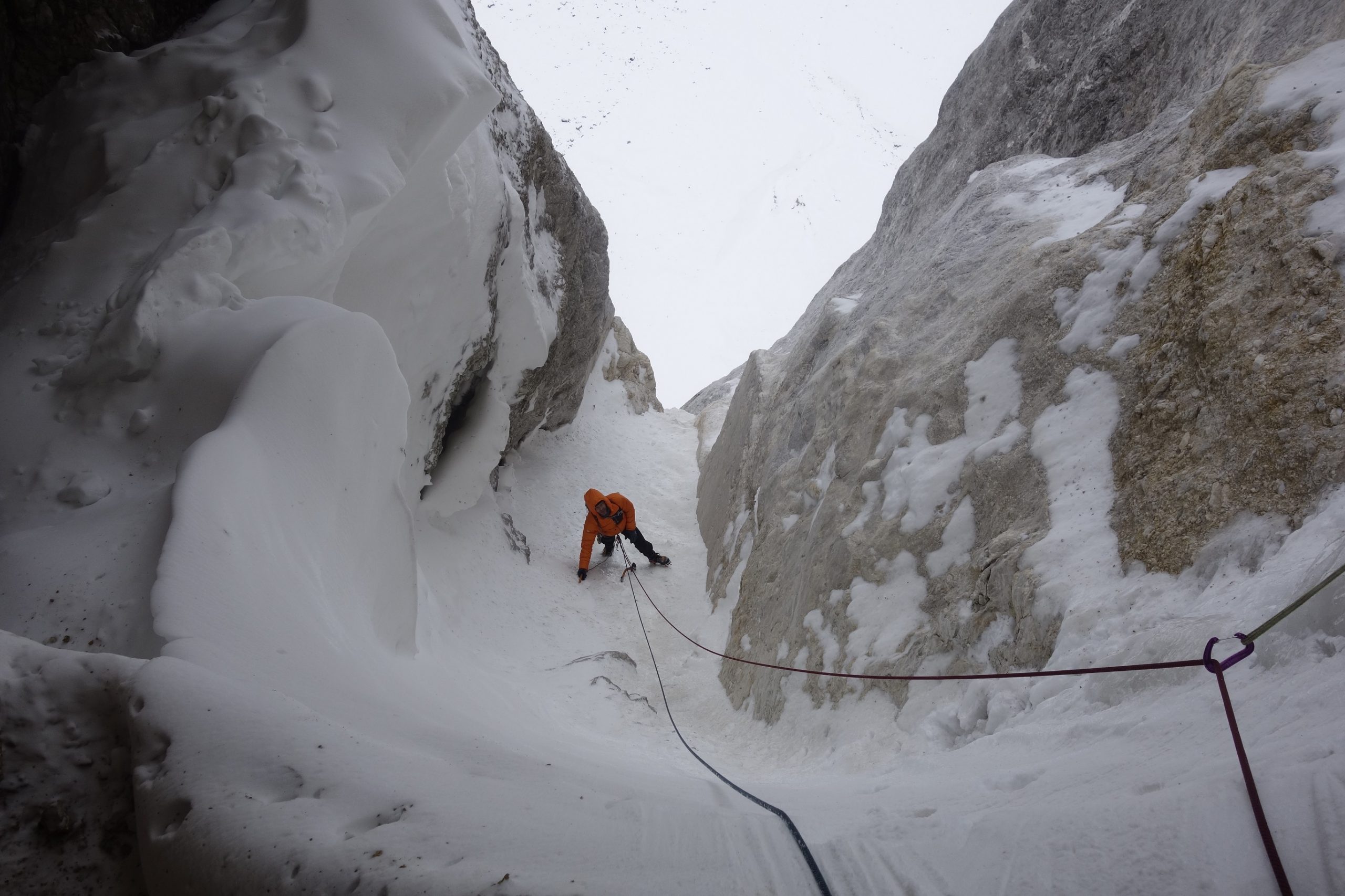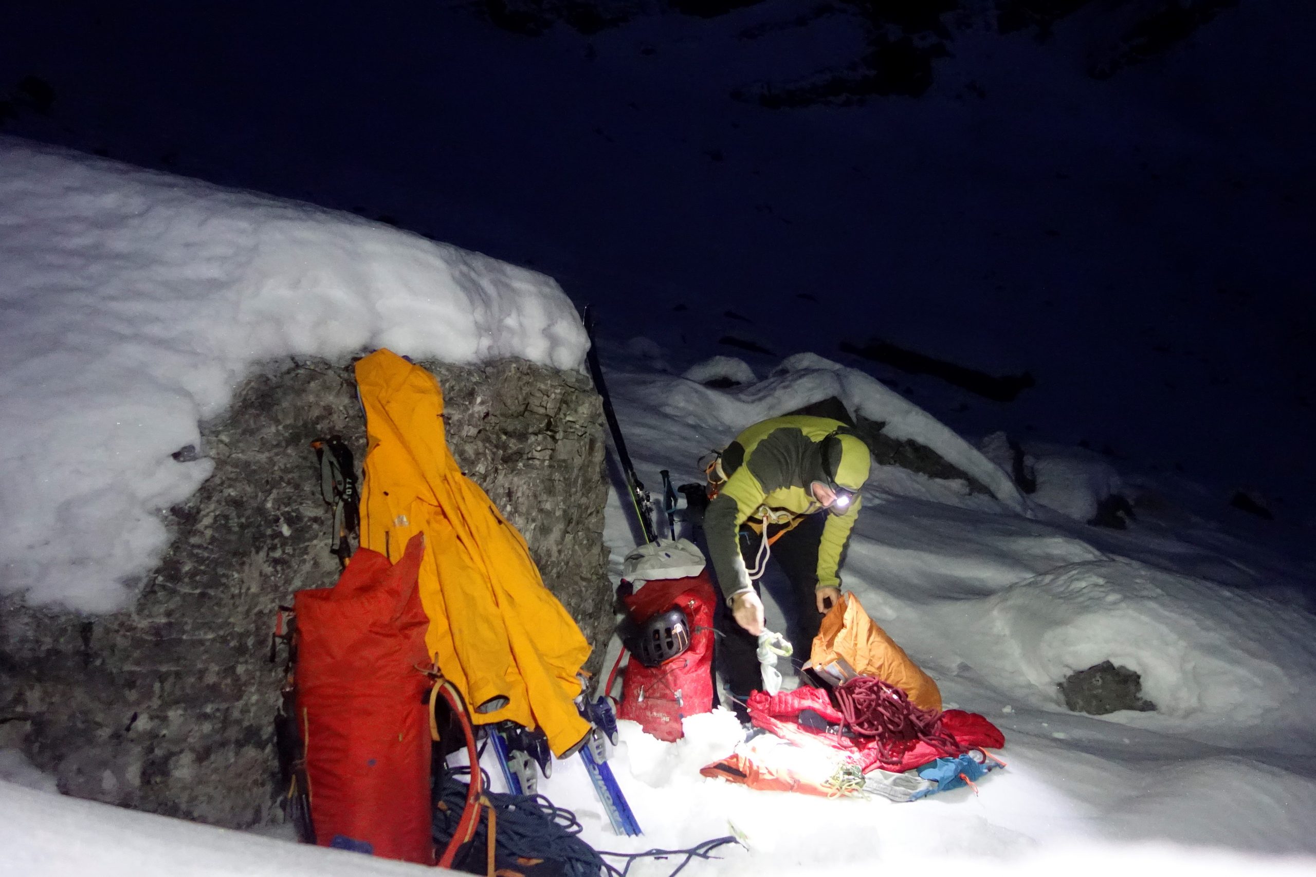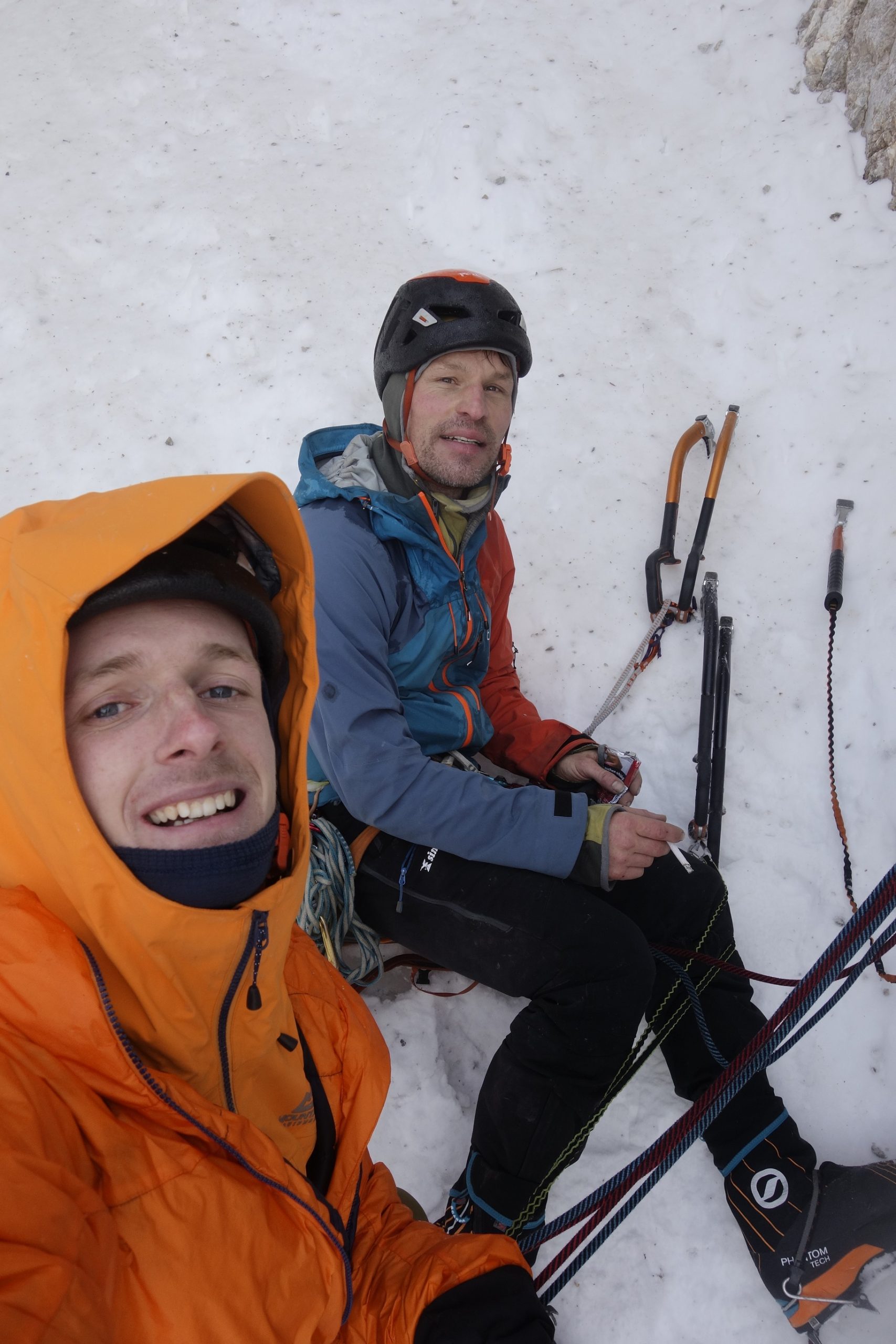 Ich beginne Pläne von einem Sitzbiwak zu schmieden, um bei Tageslicht die letzten Meter zu klettern. David wollte einfach nur in diese Höhle. Nach etwa 2 Stunden, die wir für diese 20 Meter benötigten und einer freien Begehung im Nachstieg meinerseits, war mein Sportkletter-Ehrgeiz ob einer Begehung dieser Linie im besten denkbaren Stil wieder geweckt. Ich kann es nicht erklären, aber so sicher wie ich einen weiteren Vorstieg in dieser Nacht ausgeschlossen habe, so schnell war die Entscheidung am Standplatz gefallen: «Komm, ich schau da noch hoch.» Vielleicht lag es daran, dass ich in Davids Ausdruck sofort erkennen musste, dass er hier und jetzt abseilen wird, wenn nicht ich nochmal vorsteige. Es folgte eine 55 Meter lange Länge durch einen unglaublich gestapelten Bruchhaufen, mehrere wundervoll singende Haken und zum ersten Mal an dem Tag ein perfektes Cam-Placement nach dem anderen. Beschwingt von so viel Sicherheit wie den ganzen Tag noch nicht bei überraschend einfachem Gelände wühlte ich mich im mittlerweile einsetzenden Schneefall dem Ende entgegen. Dem Ende dieser Linie, aber nicht dem Ende dieser Tour, nicht dem Ende dieses Tages – mit der Ankunft um 23:30 am Ausstieg vielmehr dem Anfang eines neuen – und vor allem, nicht dem Ende dieser – wie David sagt – harmonisch unharmonischen Seil- und Freundschaft.