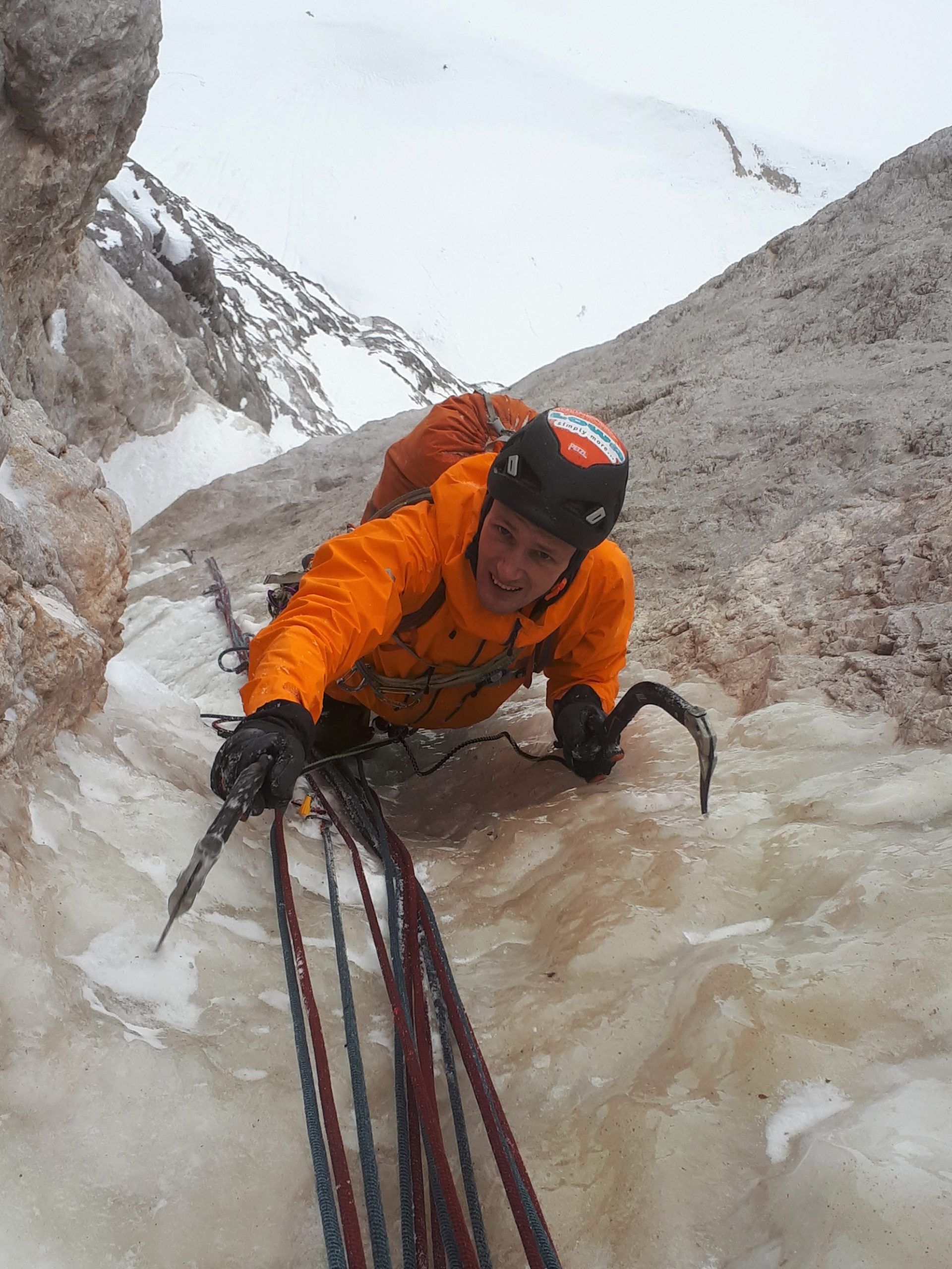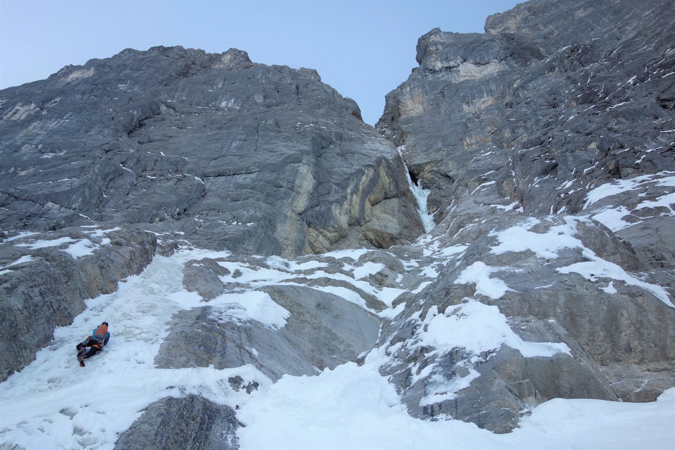 Aber jetzt kommt ja der einfache Teil, hat David gesagt. Irgendwas mit Schneerinne und Stapfen, ja das klingt gut. Nach 20 Metern artete das Stapfen aber relativ abrupt wieder in nahezu nicht senkrechtes Schnee-Gewühle aus, das mich wiederum unter die klettertechnische Schlüssellänge brachte. Ein etwa 4 Meter hoher Überhang, der bei mehr Schnee mit Sicherheit einfach überstapft werden kann, versperrte den Weg. All mein Hoffen, dass ja eigentlich David dran wäre mit Vorsteigen, ging nicht in Erfüllung. Mit nur 40 Meter Stapfen meinerseits ließ sich David verständlicherweise nicht abspeisen und er wünschte mir viel Spaß. Na toll. Direkt nach dem Standplatz ließ sich im Dachwinkel ein perfekter Totem legen, ich traversierte an einer brüchigen Untergriff-Schuppe nach links bis an die Dachkante, konnte nochmals einen kleinen Totem legen und stand dann da. Ein Eisgerät im semi-vertrauenserweckenden Eis über dem Dach, da wo das kleine Eissäulchen angesetzt hatte, bevor ich es runtergestoßen habe. Das andere Gerät weit unterhalb noch irgendwo verkeilt hing ich nun da und überlegte hin und her. Aber ich kann doch jetzt nicht ernsthaft in so einer Tour eine „Figure of 4“ auf mein Eisgerät machen? Das, nein, das erschien mir auch in dieser ziemlich kranken Route over the top zu sein. Nach minutenlangem Zögern entschied ich mich endlich die Füße rausschwingen zu lassen, blockte 2, 3 Mal in besseres Eis durch und zog die Füße so ästhetisch wie man es sich nur vorstellen kann hinterher, bis ich ein Knie über die Dachkante wuchten konnte. Zeitgleich mit dem unumkehrbaren Entschluss die Füße kommen zu lassen begann ein Spindrift von oben mein Gesicht einzueisen. Ich bin mir regelrecht verarscht vorgekommen: Da eiere ich minutenlang hin und her, und in dem einen Moment, in dem es kein Zurück mehr gab, schlägt der Berg zu. Welch ein Klischee aus vergangenen Zeiten, aber langsam begannen wir es persönlich zu nehmen. Jetzt muss es doch mal einfach werden?! Einfacher, ja. Einfach wohl eher nicht.