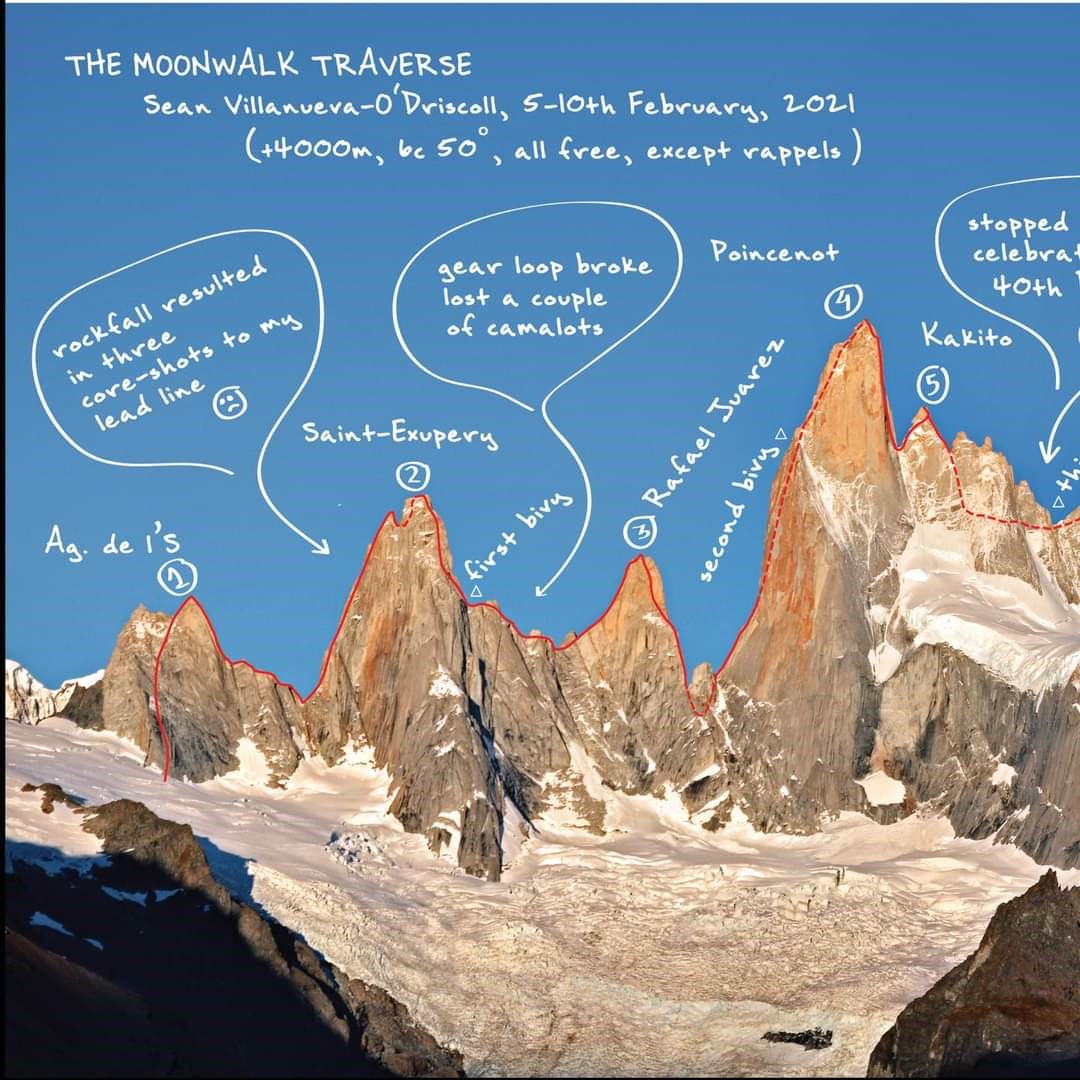 Der belgische Kletterer Sean Villanueva O’Driscoll konnte vom 5. bis 10. Februar 2021 als Erster solo die Fitz Roy-Überquerung, den sogenannten „Moonwalk“ absolvieren.