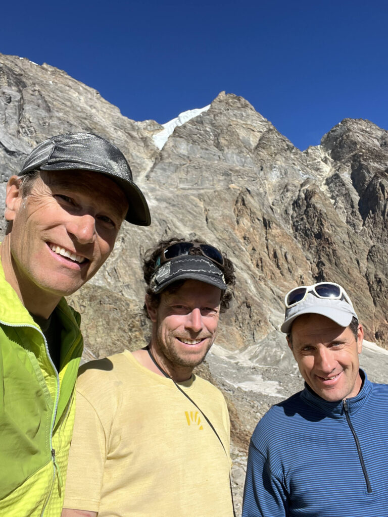 Mit Peter von Känel und Rolf Zurbrügg habe ich die perfekten Partner für diese Unternehmung an meiner Seite. Am 11. Oktober steigen wir zur Rottalhütte auf und am nächsten Tag geht steigen wir ein. Die ersten drei Stunden klettern wir im Licht der Stirnlampen auf dem Pfeilersystem im unteren Wandteil. Wir folgen keiner spezifischen Linie, die Schwierigkeiten sind – bis auf zwei Seillängen im Bereich 6a – im dritten bis fünften Schwierigkeitsgrad.