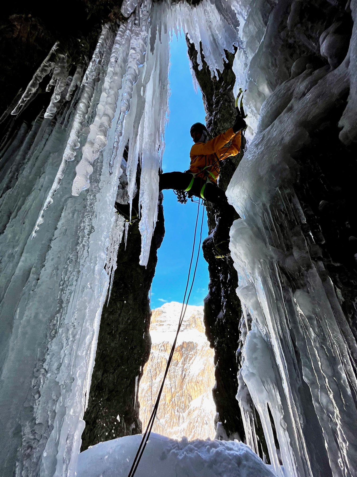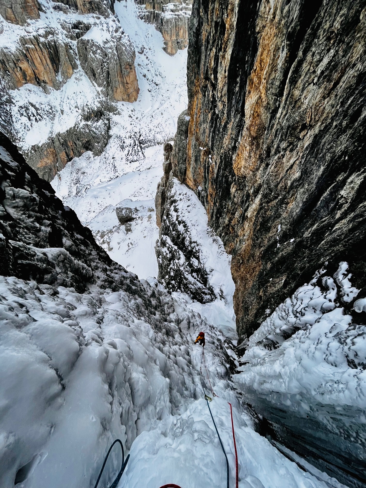 Die beiden Simon Gietl und Vittorio Messini eröffnen mit „Eywa“ eine beeindruckende Mixedline an der Pordoi Westwand. Die 670 Meter (Teil 1 bis zum großen Band 330 Meter,WI6, M6; Teil 2 WI5, M6 240 Meter). Die Route ist im Grunde genommen, keine reine Erstbegehung, sondern eine aus der Kombination verschiedener alter Felsrouten entstandene Mixedroute.