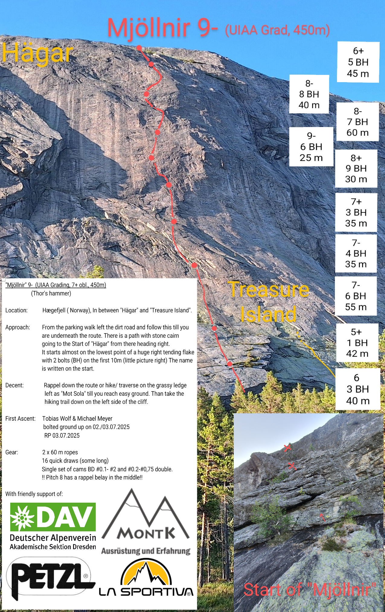 Der erste Tag an unserem Projekt startete spät und anders als gedacht. Um 6:00 Uhr nieselt es noch auf dem Zeltplatz am Nisser. Also noch 1h Weiterschlafen. Der schnelle Start verzögerte sich weiter, weil wir einen Zustiegspfad zu zeitig abbiegen und voll beladen mit Seilen, Bohrmaschine & Haken, Akkus, Friends & Keilen an der Wand entlang stolpern. Durch das nasse Gras waren die Schuhe sowie die Hosen bis zum Knie durchgeweicht. Es ging zum Glück etwas Wind und somit trocknete der Fels schnell ab.Die Sonne scheint und es wird angenehm warm.So etwas waren wir vom Hæhefjell bisher nicht gewohnt. Da wir wegen einer 10m hohen Steilstufe am Wandfuß den oberen Wandteil nicht sehen konnten liefen wir erst mal 200m zu weit. Also alles Material wieder zurückgeschleppt. Gegen 10:00 Uhr, also für meinen Geschmack zu spät, ging es endlich ans Klettern. Zum Glück ging das Klettern dann besser als der Zustieg, vom kleinen Angriff der Wespen, die irgendwo im Felsen nisten, einmal abgesehen.Die ersten 10m waren etwas bröselig aber 2 Bohrhaken (BH) sicherten dies gut ab.